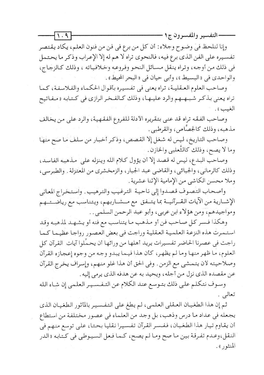 وهكذا فسَّر كل صاحب فن أو مذهب بما يتناسب مع فنه أو يشهد لمذهبه، وقد استمرت هذه النزعة العلمية العقلية وراجت فى بعض العصور رواجاً عظيماً، كما راجت فى عصرنا الحاضر تفسيرات يريد أهلها من ورائها أن يُحَمِّلوا آيات القرآن كل العلوم، ما ظهر منها وما لم يظهر، كأن هذا فيما يبدو وجه من وجوه إعجاز القرآن وصلاحيته لأن يتمشى مع الزمن. وفى الحق أن هذا غلو منهم، وإسراف يُخرج القرآن عن مقصده الذى نزل من أجله، ويحيد به عن هدفه الذى يرمى إليه.