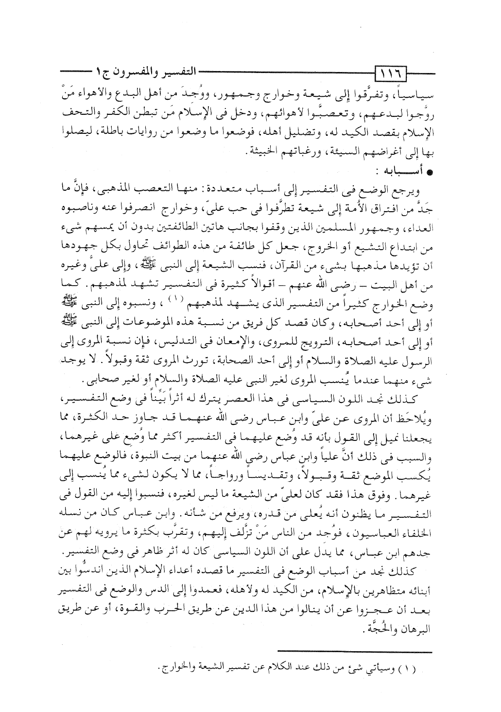 ويرجع الوضع فى التفسير إلى أسباب متعددة: منها التعصب المذهبى، فإنَّ ما جَدَّ من افتراق الأُمة إلى شيعة تطرَّفوا فى حب علىّ، وخوارج انصرفوا عنه وناصبوه العداء، وجمهور المسلمين الذين وقفوا بجانب هاتين الطائفتين بدون أن يمسهم شئ من ابتداع التشيع أو الخروج، جعل كل طائفة من هذه الطوائف تحاول بكل جهودها أن تؤيد مذهبها بشئ من القرآن، فنسب الشيعة إلى النبى صلى الله عليه وسلم، وإلى علىّ وغيره من أهل البيت - رضى الله عنهم - أقوالاً كثيرة من التفسير تشهد لمذهبهم. كما وضع الحوارج كثيراً من التفسير الذى يشهد لمذهبهم، ونسبوه إلى النبى صلى الله عليه وسلم أو إلى أحد أصحابه، وكان قصد كل فريق من نسبة هذه الموضوعات إلى النبى صلى الله عليه وسلم أو إلى أحد أصحابه، الترويج للمروى، والإمعان فى التدليس، فإن نسبة المروى إلى الرسول عليه الصلاة والسلام أو إلى أحد الصحابة، تورث المروى ثقة وقبولاً. لا يوجد شئ منهما عندما يُنسب المروى لغير النبى عليه الصلاة والسلام أو لغير صحابى.