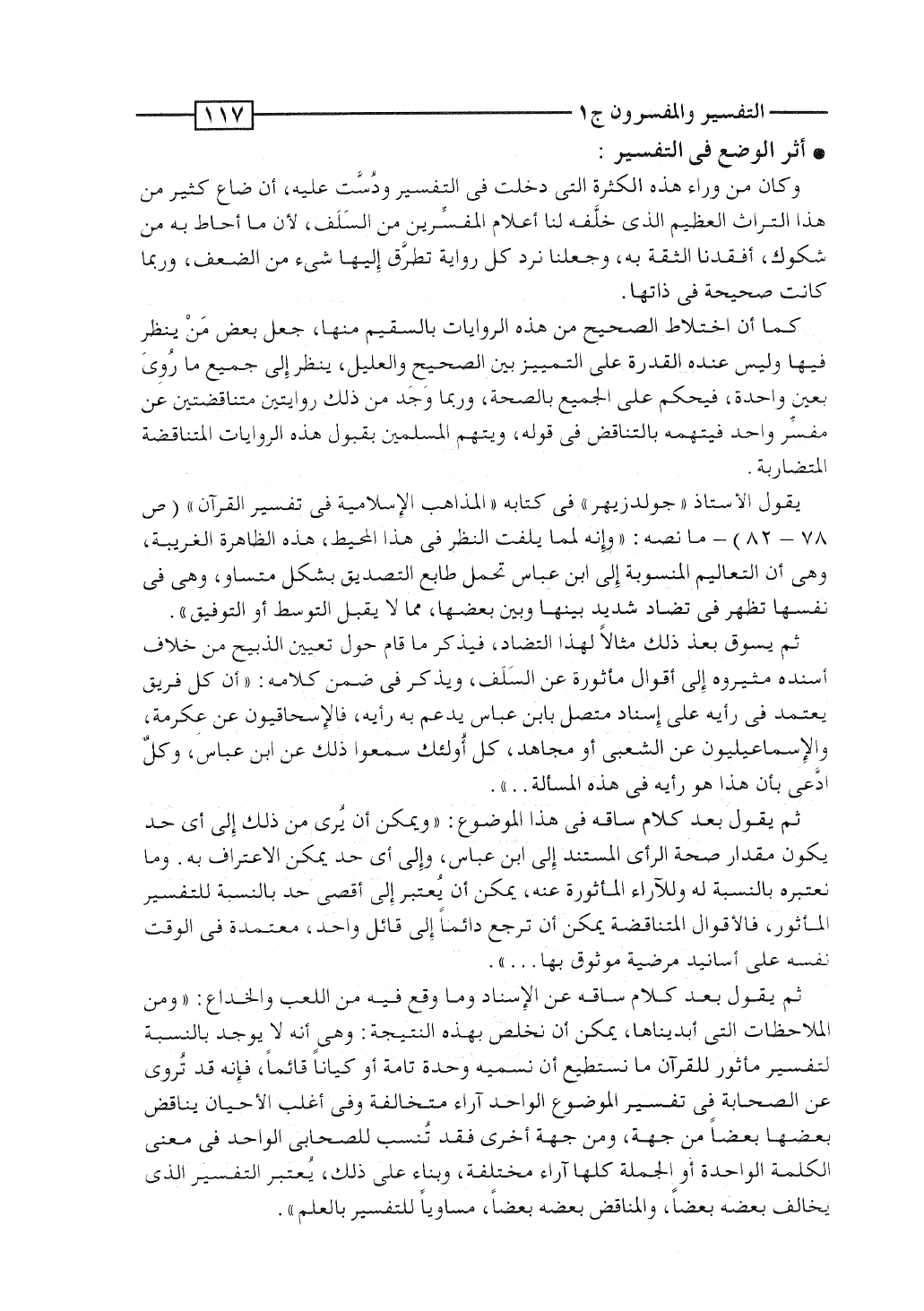 ثم يقول بعد كلام ساقه فى هذا الموضوع: "ويمكن أن يُرى من ذلك إلى أى حد يكون مقدار صحة الرأى المستند إلى ابن عباس، وإلى أى حد يمكن الاعتراف به. وما نعتبره بالنسبة له وللآراء المأثورة عنه، يمكن أن يُعتبر إلى أقصى حد بالنسبة للتفسير المأثور، فالأقوال المتناقضة يمكن أن ترجع دائماً إلى قائل واحد، معتمدة فى الوقت نفسه على أسانيد مرضية موثوق بها ... "