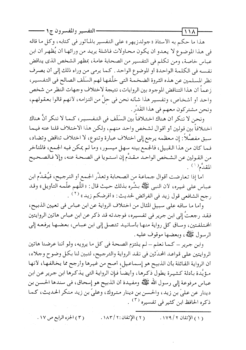 وابن جرير - كما نعلم - لم يلتزم الصحة فى كل ما يرويه، ولو أننا عرضنا هاتين الروايتين على قواعد المحدَثين فى نقد الرواية والترجيح، لتبين لنا بكل وضوح وجلاء، أن الرواية القائلة بأن الذبيح هو إسماعيل، أصح من غيرها وأرجح مما يخالفها، لأنها مؤيَّدة بأدلة كثيرة يطول ذكرها، وأيضاً فإن الرواية التى يذكرها ابن جرير عن ابن عباس مرفوعة إلى رسول الله صلى الله عليه وسلم ومقيدة أن الذبيح هو إسحاق، فى سندها الحسن بن دينار عن علىّ بن زيد، والحسن بن دينار متروك، وعلىّ بن زيد منكر الحديث، كما ذكره الحافظ ابن كثير فى تفسيره.