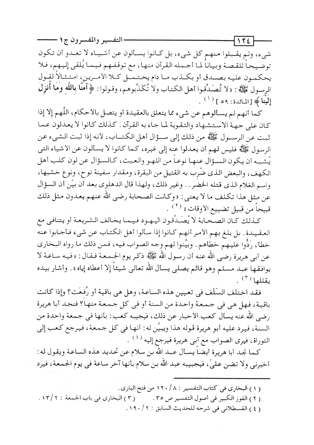 كذلك كان الصحابة لا يُصَدِّقون اليهود فيما يخالف الشريعة أو يتنافى مع العقيدة. بل بلغ بهم الأمر أنهم كانوا إذا سألوا أهل الكتاب عن شئ فأجابوا عنه خطأ، رَدُّوا عليهم خطأهم. وبيَّنوا لهم وجه الصواب فيه، فمن ذلك ما رواه البخارى عن أبى هريرة رضى الله عنه أن رسول الله صلى الله عليه وسلم ذكر يوم الجمعة فقال: "فيه ساعة لا يوافقها عبد مسلم وهو قائم يصلى يسأل الله تعالى شيئاً إلا أعطاه إياهوأشار بيده يقللها".