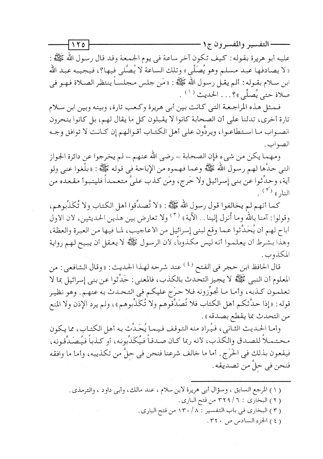 كما أنهم لم يخالفوا قول رسول الله صلى الله عليه وسلم: "لا تُصدِّقوا أهل الكتاب ولا تُكَذِّبوهم، وقولوا: آمنا بالله وما أُنزل إلينا ... الآية" ولا تعارض بين هذين الحديثين، لأن الأول أباح لهم أن يُحَدِّثوا عما وقع لبنى إسرائيل من الأعاجيب، لما فيها من العبرة والعظة، وهذا بشرط أن يعلموا أنه ليس مكذوباً، لأن الرسول صلى الله عليه وسلم لا يعقل أن يبيح لهم رواية المكذوب.