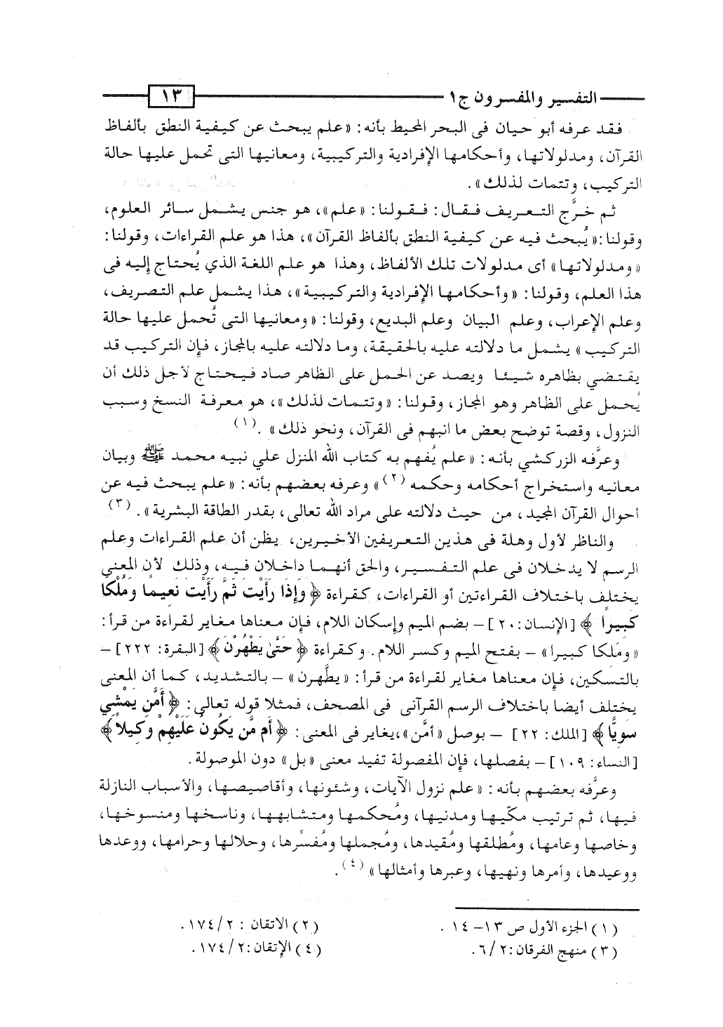 ثم خرَّج التعريف فقال: "فقولنا: "علم"، هو جنس يشمل سائر العلوم، وقولنا: "يُبحث فيه عن كيفية النطق بألفاظ القرآن"، هذا هو علم القراءات، وقولنا: "ومدلولاتها" أي مدلولات تلك الألفاظ، وهذا هو علم اللغة الذى يُحتاج إليه فى هذا العلم، وقولنا: "وأحكامها الإفرادية والتركيبة"، هذا يشمل علم التصريف، وعلم الإعراب، وعلم البيان، وعلم البديع، وقولنا: "ومعانيها التى تُحمل عليها حالة التركيب"، يشمل ما دلالته عليه بالحقيقة، وما دلالته عليه بالمجاز، فإن التركيب قد يقتضى بظاهره شيئاً ويصد عن الحمل على الظاهر صاد فيحتاج لأجل ذلك أن يُحمل على الظاهر وهو المجاز، وقولنا: "وتتمات لذلك"، هو معرفة النَسْخ وسبب النزول، وقصة توضح بعض ما انبهم فى القرآن، ونحو ذلك".