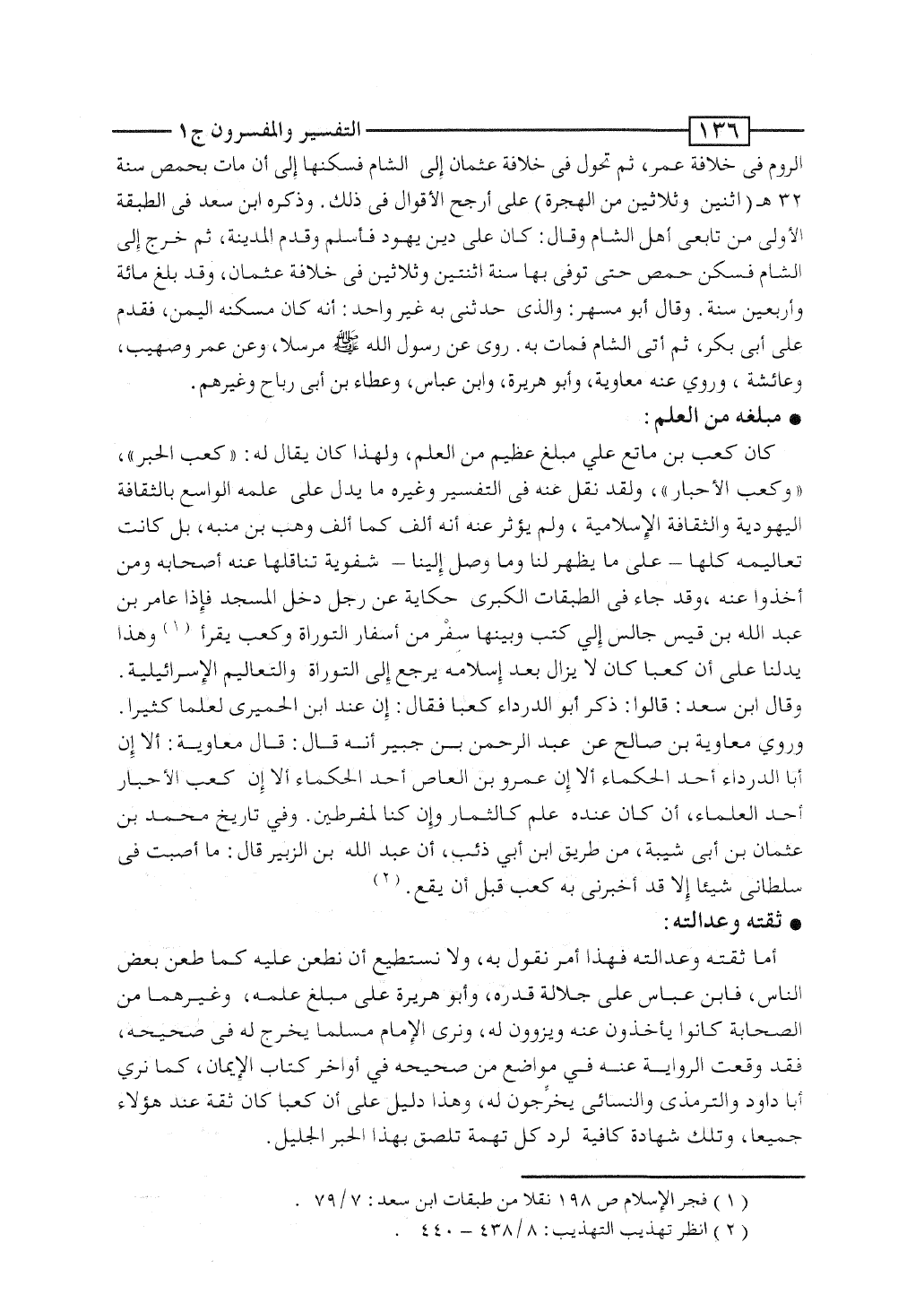 أما ثقته وعدالته فهذا أمر نقول به، ولا نستطيع أن نطعن عليه كما طعن بعض الناس، فابن عباس على جلاله قدره، وأبو هريرة على مبلغ علمه، وغيرهما من الصحابة كانوا يأخذون عنه ويروون له، ونرى الإمام مسلماً يُخرِّج له فى صحيحه، فقد وقعت الرواية عنه فى مواضع من صحيحه فى أواخر كتاب الإيمان، كما نرى أبا داود والترمذى والنسائى يُخرِّجون له، وهذا دليل على أن كعباً كان ثقة عند هؤلاء جميعاً، وتلك شهادة كافية لرد كل تهمة تلصق بهذا الحَبْر الجليل.