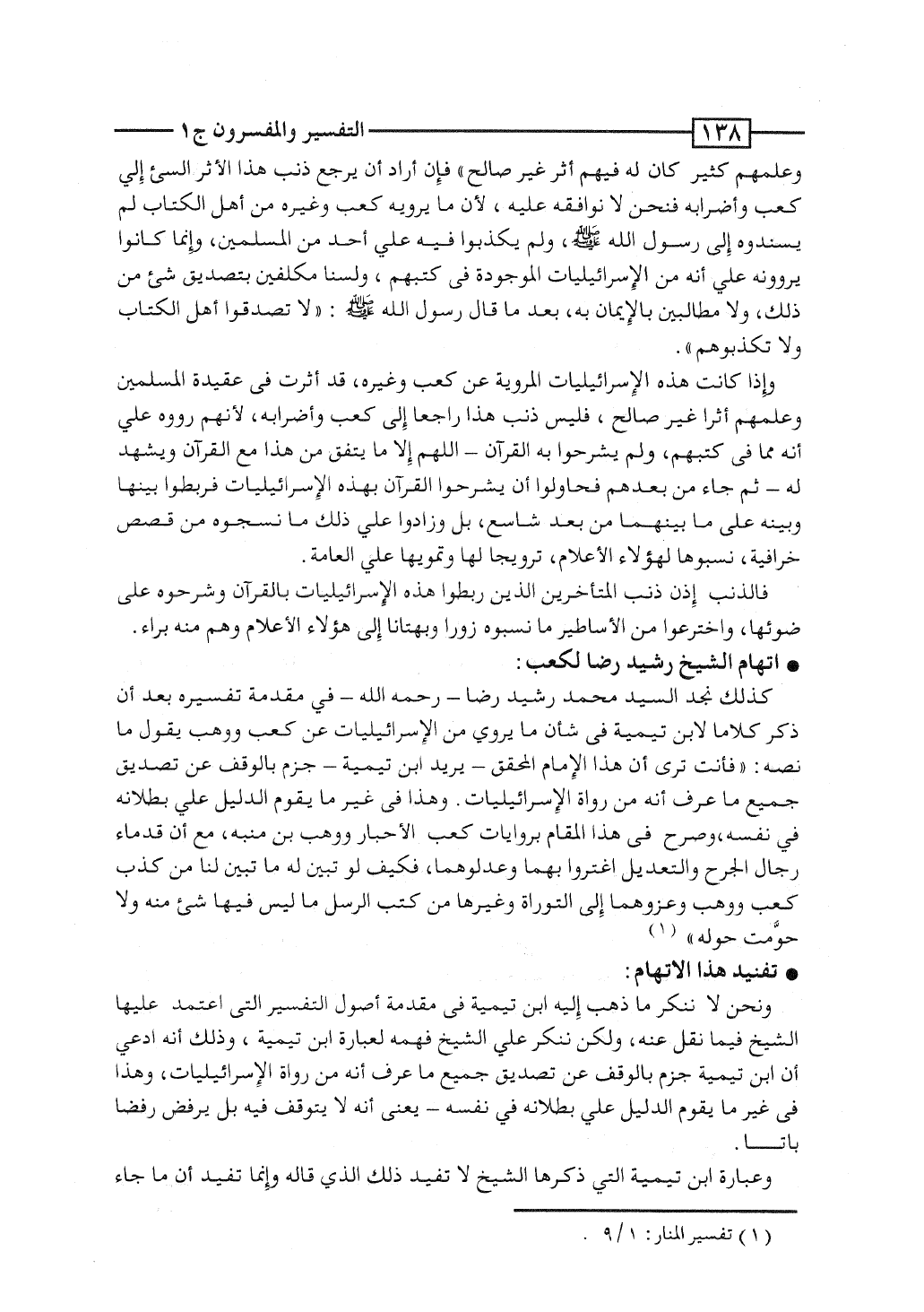 كذلك نجد السيد محمد رشيد رضا - رحمه الله - فى مقدمة تفسيره بعد أن ذكر كلاماً لابن تيمية فى شأن ما يُروَى من الإسرائيليات عن كعب ووهب يقول ما نصه: "فأنت ترى أن هذا الإمام المحقق - يريد ابن تيمية - جزم بالوقف عن تصديق جميع ما عُرِف أنه من رواة الإسرائيليات. وهذا فى غير ما يقوم الدليل على بطلانه فى نفسه، وصرَّح فى هذا المقام بروايات كعب الأحبار ووهب بن منبِّه، مع أن قدماء رجال الجرح والتعديل اغتروا بهما وعدَّلوهما، فكيف لو تبين له ما تبين لنا من كذب كعب ووهب وعزوهما إلى التوراة وغيرها من كتب الرسل ما ليس فيها شئ منه ولا حوَّمت حوله".
