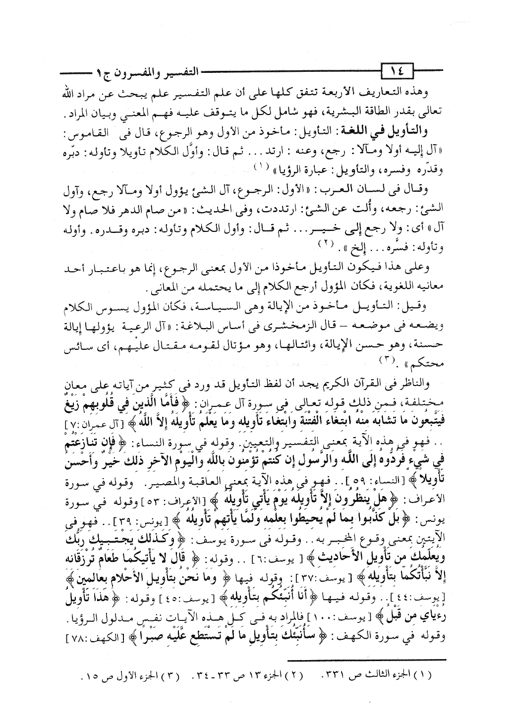 والناظر فى القرآن الكريم يجد أن لفظ التأويل قد ورد فى كثير من آياته على معان مختلفة، فمن ذلك قوله تعالى فى سورة آل عمران آية [7] : {فَأَمَّا الَّذِينَ في قُلُوبِهِمْ زَيْغٌ فَيَتَّبِعُونَ مَا تَشَابَهَ مِنْهُ ابتغاء الفتنة وابتغاء تَأْوِيلِهِ وَمَا يَعْلَمُ تَأْوِيلَهُ إِلاَّ الله} .. فهو فى هذه الآية بمعن التفسير والتعيين. وقوله فى سورة النساء آية [59] : {فَإِن تَنَازَعْتُمْ فِي شَيْءٍ فَرُدُّوهُ إِلَى الله والرسول إِن كُنْتُمْ تُؤْمِنُونَ بالله واليوم الآخر ذلك خَيْرٌ وَأَحْسَنُ تَأْوِيلاً} .. فهو فى هذه الآية بمعنى العاقبة والمصير. وقوله فى سورة الأعراف آية [53] : {هَلْ يَنظُرُونَ إِلاَّ تَأْوِيلَهُ يَوْمَ يَأْتِي تَأْوِيلُهُ} .. وقوله فى سورة يونس آية [39] : {بَلْ كَذَّبُواْ بِمَا لَمْ يُحِيطُواْ بِعِلْمِهِ وَلَمَّا يَأْتِهِمْ تَأْوِيلُهُ} .. فهو فى الآيتين بمعنى وقوع المخبر به. وقوله فى سورة يوسف آية [6] : {وكذلك يَجْتَبِيكَ رَبُّكَ وَيُعَلِّمُكَ مِن تَأْوِيلِ الأحاديث} .. وقوله فيها أيضاً آية [37] : {قَالَ لاَ يَأْتِيكُمَا طَعَامٌ تُرْزَقَانِهِ إِلاَّ نَبَّأْتُكُمَا بِتَأْوِيلِهِ} .. وقوله فى آية [44] منها: {وَمَا نَحْنُ بِتَأْوِيلِ الأحلام بِعَالِمِينَ} .. وقوله فى آية [45] منها: {أَنَاْ أُنَبِّئُكُمْ بِتَأْوِيلِهِ} .. وقوله فى آية [100] منها: {هاذا تَأْوِيلُ رُؤْيَايَ مِن قَبْلُ} .. فالمراد به فى كل هذه الآيات نفس مدلول الرؤيا. وقوله فى سورة الكهف آية: [78] : {سَأُنَبِّئُكَ بِتَأْوِيلِ مَا لَمْ تَسْتَطِع عَّلَيْهِ صَبْراً} ..