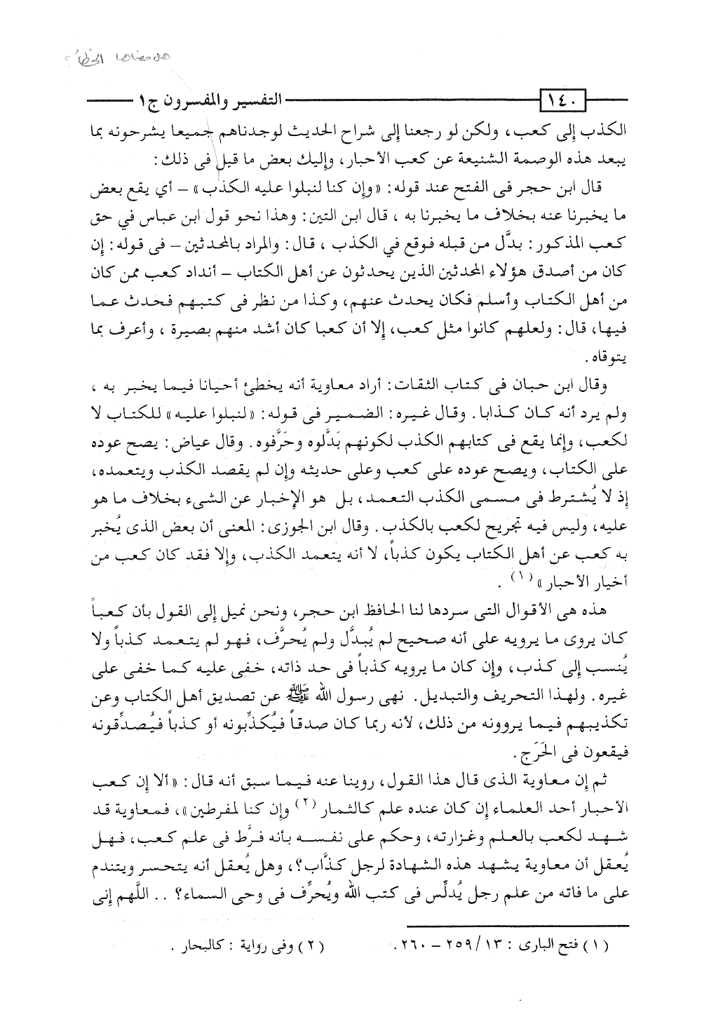 وقال ابن حبان فى كتاب الثقات: أراد معاوية أنه يخطئ أحياناً فيما يُخبر به، ولم يرد أنه كان كذَّاباً. وقال غيره: الضمير فى قوله: "لنبلوا عليه" للكتاب لا لكعب، وإنما يقع فى كتابهم الكذب لكونهم بَدَّلوه وحَرَّفوه. وقال عياض: يصح عوده على الكتاب، ويصح عوده على كعب وعلى حديثه وإن لم يقصد الكذب ويتعمده، إذ لا يُشترط فى مسمى الكذب التعمد، بل هو الإخبار عن الشئ بخلاف ما هو عليه، وليس فيه تجريح لكعب بالكذب. وقال ابن الجوزى: المعنى أن بعض الذى يُخبر به كعب عن أهل الكتاب يكون كذباً، لا أنه يتعمد الكذب، وإلا فقد كان كعب من أخيار الأحبار".