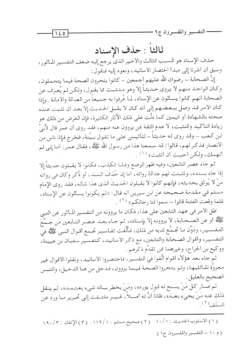 حذف الإسناد هو السبب الثالث والأخير الذى يرجع إليه ضعف التفسير المأثور، وسبق أن أشرنا إلى مبدأ اختصار الأسانيد، ونعود إليه فنقول: