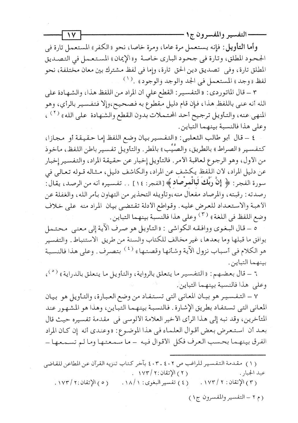 5 - قال البغوى ووافقه الكواشى: "التأويل هو صرف الآية إلى معنى محتمل يوافق ما قبلها وما بعدها، غير مخالف للكتاب والسُّنَّة من طريق الاستنباط. والتفسير هو الكلام فى أسباب نزول الآية وشأنها وقصتها" بتصرف. وعلى هذا فالنسبة بينهما التباين.
