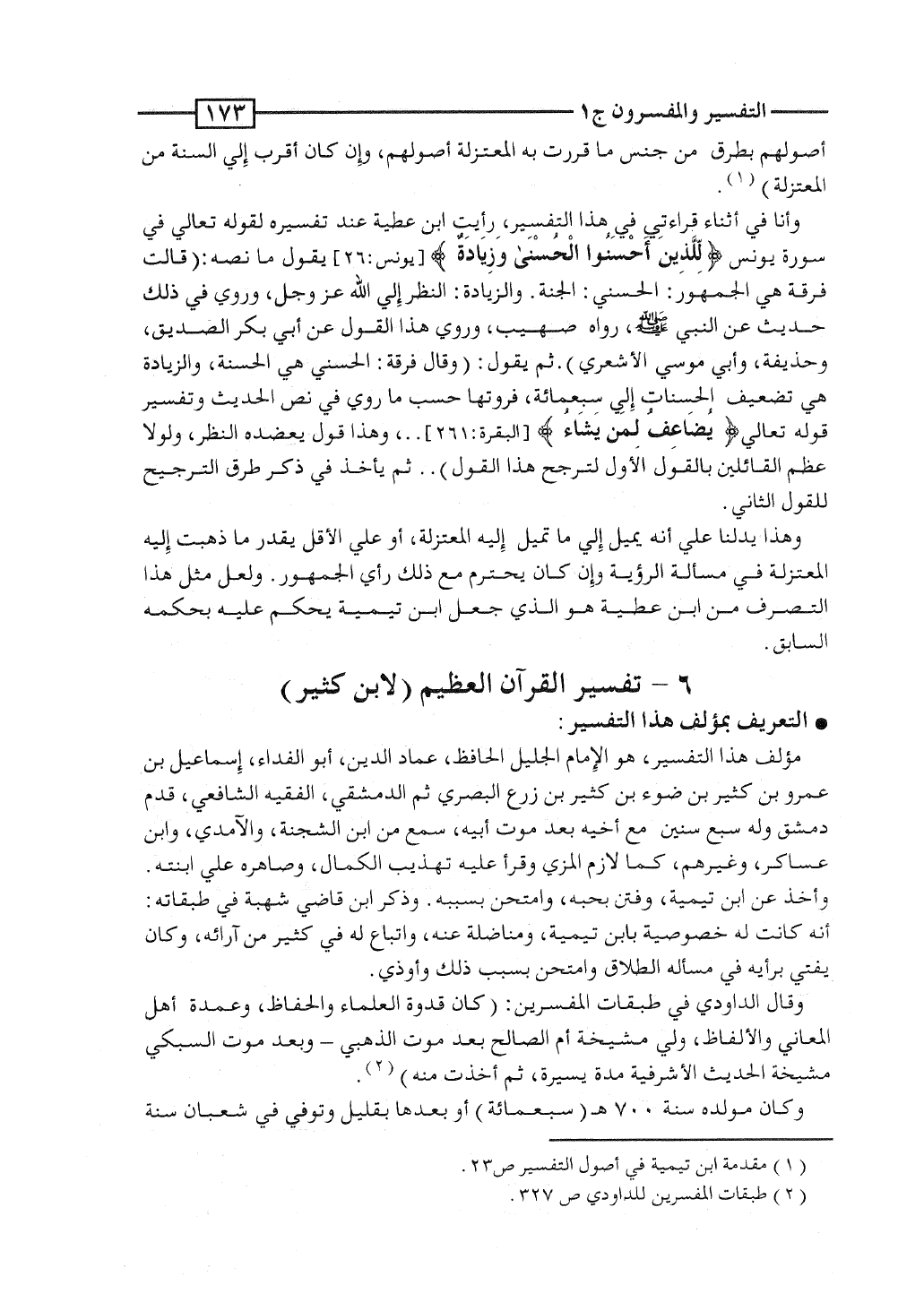 وأنا فى أثناء قراءتى فى هذا التفسير، رأيت ابن عطية عند تفسيره لقوله تعالى فى الآية [26] من سورة يونس: {لِّلَّذِينَ أَحْسَنُواْ الحسنى وَزِيَادَةٌ} .. يقول ما نصه: "قالت فرقة هى الجمهور: الحُسنى: الجنة. والزيادة: النظر إلى الله عزَّ وجَلَّ، ورُوى فى ذلك حديث عن النبى صلى الله عليه وسلم، رواه صهيب، ورُوى هذا القول عن أبى بكر الصِدِّيق، وحُذيفة، وأبى موسى الأشعرى.. ".