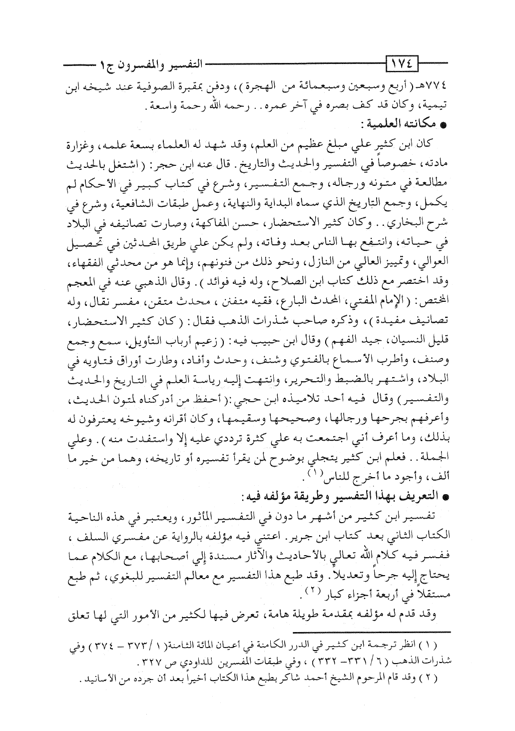 تفسير ابن كثير من أشهر ما دُوِّن فى التفسير المأثور، ويُعتبر فى هذه الناحية الكتاب الثانى بعد كتاب ابن جرير. اعتنى فيه مؤلفه بالرواية عن مفسِّرى السَلَف، ففسَّر فيه كلام الله تعالى بالأحاديث والآثار مسندة إلى أصحابها، مع الكلام عما يحتاج إليه جرحاً وتعديلاً. وقد طُبِع هذا التفسير مع معالم التفسير للبغوى، ثم طُبِع مستقلاً فى أربعة أجزاء كبار.