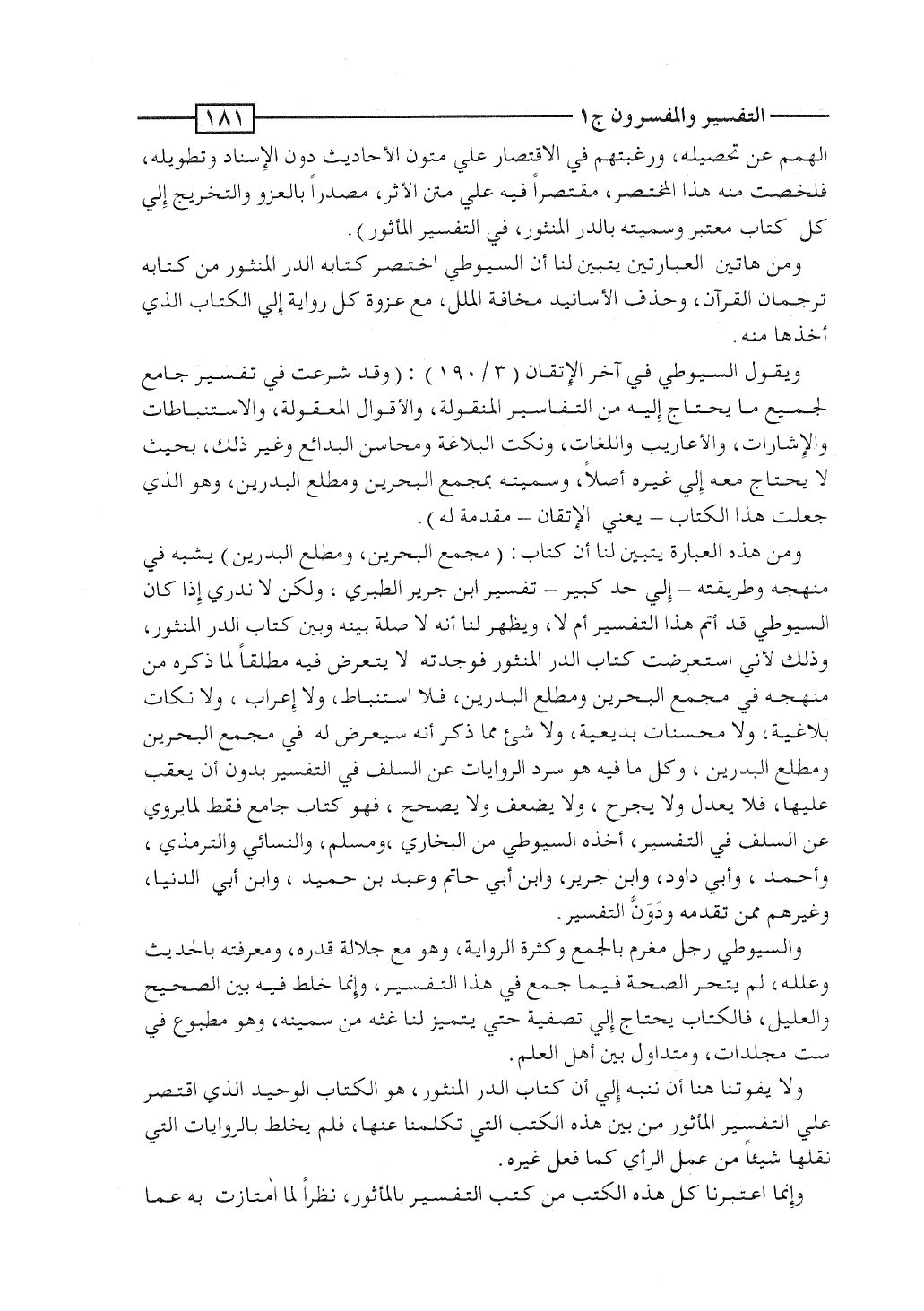 ولا يفوتنا هنا أن ننبه إلى أن كتاب الدُرّ المنثور، هو الكتاب الوحيد الذى اقتصر على التفسير المأثور من بين هذه الكتب التى تكلمنا عنها، فلم يخلط بالروايات التى نقلها شيئاً من عمل الرأى كما فعل غيره.