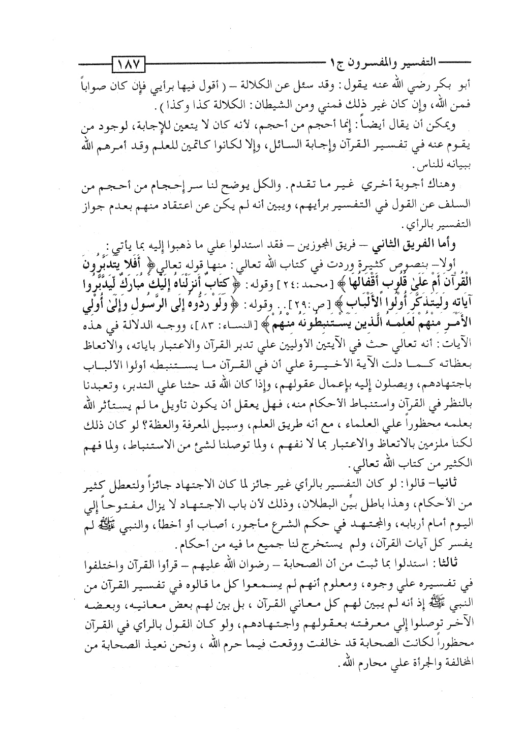 ثالثاً - استدلوا بما ثبت من أن الصحابة - رضوان الله عليهم - قرأوا القرآن واختلفوا فى تفسيره على وجوه، ومعلوم أنهم لم يسمعوا كل ما قالوه فى تفسير القرآن من النبى صلى الله عليه وسلم، إذ أنه لم يُبيِّن لهم كل معانى القرآن، بل بَيَّنَ لهم بعض معانيه، وبعضه الآخر توَّصلوا إلى معرفته بعقولهم واجتهادهم، ولو كان القول بالرأى فى القرآن محظوراً لكانت الصحابة قد خالفت ووقعت فيما حرَّم الله، ونحن نُعيذ الصحابة من المخالفة والجرُأة على محارم الله.