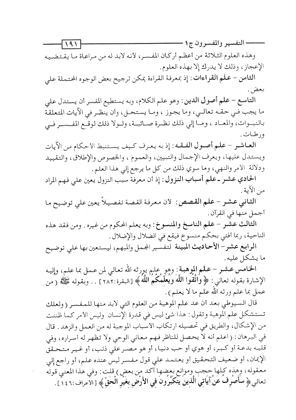 قال السيوطى بعد أن عَدَّ علم الموهبة من العلوم التى لا بد منها للمفسِّر: "ولعلك تستشكل علم الموهبة وتقول: هذا شئ ليس فى قدرة الإنسان. وليس الأمر كما ظننت من الإشكال، والطريق فى تحصيله ارتكاب الأسباب الموجبة له من العمل والزهد. قال فى البرهان: "اعلم أنه لا يحصل للناظر فهم معانى الوحى ولا تظهر له أسراره، وفى قلبه بدعة، أو كبر، أو هوى، أو حب دنيا، أو هو مُصِّرُ على ذنب، أو غير متحقق بالإيمان، أو ضعيف التحقيق، أو يعتمد على قول مفسِّر ليس عنده علم، أو راجع إلى معقوله، وهذه كلها حُجُب وموانع بعضها آكد من بعض" قلت: وفى هذا المعنى قوله تعالى: {سَأَصْرِفُ عَنْ آيَاتِي الذين يَتَكَبَّرُونَ فِي الأرض بِغَيْرِ الحق} [الأعراف: 146]