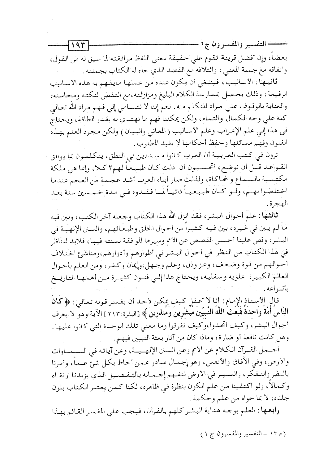 ثانيها: الأساليب، فينبغى أن يكون عنده من عملها ما يفهم به هذه الأساليب الرفيعة، وذلك يحصل بممارسة الكلام البليغ ومزاولته، مع التفطن لنكته ومحاسنه، والعناية بالوقوف على مراد المتكلم منه. نعم إننا لا نتسامى إلى فهم مراد الله تعالى كله على وجه الكمال والتمام، ولكن يمكننا فهم ما نهتدى به بقدر الطاقة، ويُحتاج فى هذا إلى علم الإعراب وعلم الأساليب (المعانى والبيان) ولكن مجرد العلم بهذه الفنون وفهم مسائلها وحفظ أحكامها لا يفيد المطلوب.