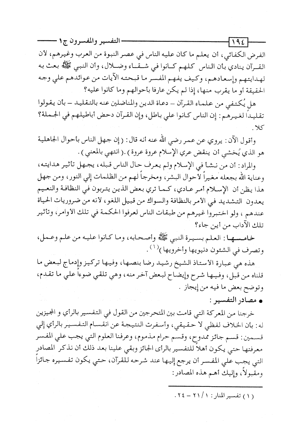 الفرض الكفائى، أن يعلم ماكان عليه الناس فى عصر النبوة من العرب وغيرهم، لأن القرآن ينادى بأن الناس كلهم كانوا فى شقاء وضلال، وأن النبى صلى الله عليه وسلم بُعث به لهدايتهم وإسعادهم، وكيف يفهم المفسِّر ما قبَّحته الآيات من عوائدهم على وجه الحقيقة أو ما يقرب منها، إذا لم يكن عارفاً بأحوالهم وما كانوا عليه؟