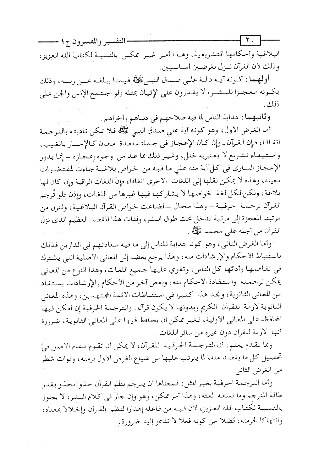 وأما الغرض الثانى، وهو كونه هداية للناس إلى ما فيه سعادتهم فى الدارين فذلك باستنباط الأحكام والإرشادات منه، وهذا يرجع بعضه إلى المعانى الأصلية التى يشترك فى تفاهمها وأدائها كل الناس، وتقوى عليها جميع اللغات، وهذا النوع من المعانى يمكن ترجمته واستفادة الأحكام منه، وبعض آخر من الأحكام والإرشادات يُستفاد من المعانى الثانوية، ونجد هذا كثيراً فى استنباط الأئمة المجتهدين، وهذه المعانى الثانوية لازمة للقرآن الكريم وبدونها لا يكون قرآناً. والترجمة الحرفية إن أمكن فيها المحافظة على المعانى الأوَّلية، فغير ممكن أن يحافظ فيها على المعانى الثانوية، ضرورة أنها لازمة للقرآن دون غيره من سائر اللغات.