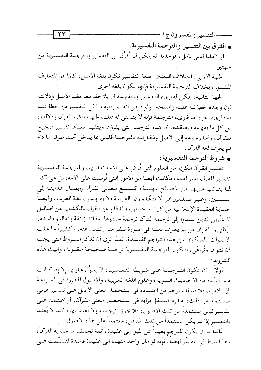 أولاً - أن تكون الترجمة على شريطة التفسير، لا يُعوَّلُ عليها إلا إذا كانت مستمَدة من الأحاديث النبوية، وعلوم اللغة العربية، والأصول المقررة فى الشريعة الإسلامية، فلا بد للمترجم من اعتماده فى استحضار معنى الأصل على تفسير عربى مستمَد من ذلك، أما إذا استقل برأيه فى استحضار معنى القرآن، أو اعتمد على تفسير ليس مستمَداً من تلك الأصول، فلا تجوز ترجمته ولا يُعتد بها، كما لا يُعتد بالتفسير إذا لم يكن مستمدَاً من تلك المناهل، معتمداً على هذه الأصول.
