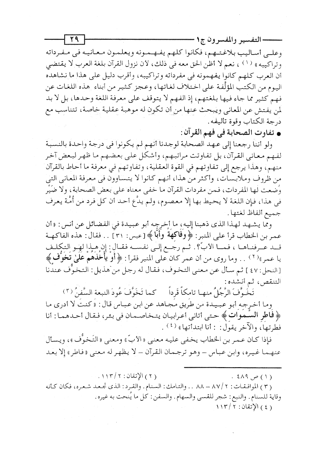 ولو أننا رجعنا إلى عهد الصحابة لوجدنا أنهم لم يكونوا فى درجة واحدة بالنسبة لفهم معانى القرآن، بل تفاوتت مراتبهم، وأشكل على بعضهم ما ظهر لبعض آخر منهم، وهذا يرجع إلى تفاوتهم فى القوة العقلية، وتفاوتهم فى معرفة ما أحاط بالقرآن من ظروف وملابسات، وأكثر من هذا، أنهم كانوا لا يتساوون فى معرفة المعانى التى وُضعت لها المفردات، فمن مفردات القرآن ما خفى معناه على بعض الصحابة، ولا ضَيْر فى هذا، فإن اللغة لا يحيط بها إلا معصوم، ولم يدَّع أحد أن كل فرد من أُمَّة يعرف جميع ألفاظ لغتها.