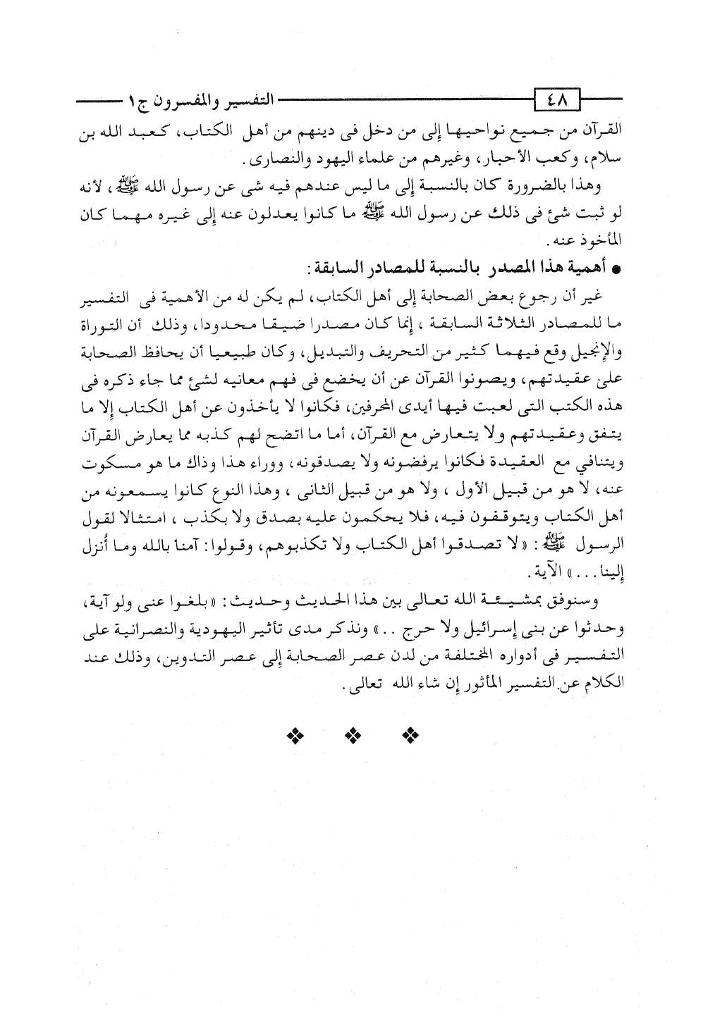 وسنوفق بمشيئة الله تعالى بين هذا الحديث وحديث: "بلِّغوا عنى ولو آية، وحدِّثوا عن بنى إسرائيل ولا حَرَج ... " ونذكر مدى تأثير اليهودية والنصرانية على التفسير فى أدواره المختلفة من لدن عصر الصحابة إلى عصر التدوين، وذلك عند الكلام عن التفسير المأثور إن شاء الله تعالى.