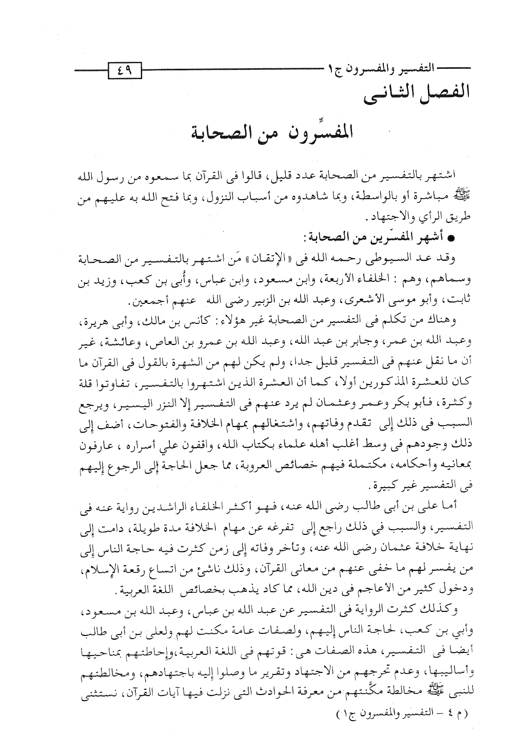 وكذلك كثرت الرواية فى التفسير عن عبد الله بن عباس، وعبد الله بن مسعود، وأُبَىّ بن كعب، لحاجة الناس إليهم، ولصفات عامة مكَّنت لهم ولعلىّ بن أبى طالب أيضاً فى التفسير، هذه الصفات هى: قوتهم فى اللغة العربية، وإحاطتهم بمناحيها وأساليبها، وعدم تحرجهم من الاجتهاد وتقرير ما وصلوا إليه باجتهادهم، ومخالطتهم للنبى صلى الله عليه وسلم مخالطة مكَّنتهم من معرفة الحوادث التى نزلت فيها آيات القرآن، نستثنى