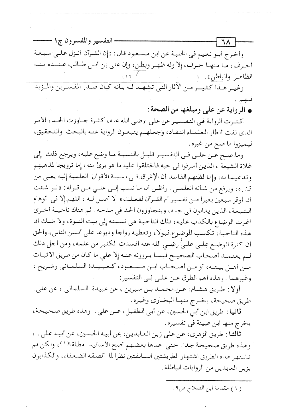 وما صح عن علىّ فى التفسير قليل بالنسبة لما وُضِع عليه، ويرجع ذلك إلى غُلاة الشيعة، الذين أسرفوا فى حبه فاختلقوا عليه ما هو برئ منه، إما ترويجاً لمذهبهم وتدعيماً له، وإما لظنهم الفاسد أن الإغراق فى نسبة الأقوال العلمية إليه يُعلى من قدره، ويرفع من شأنه العلمى. وأظن أن ما نُسب إلى علىّ من قوله: "لو شئتُ أن أُوْقِرَ سبعين بعيراً من تفسير أم القرآن لفعلت" لا أصل له، اللَّهم إلا فى أوهام الشيعة، الذين يغالون فى حبه، ويتجاوزون الحد فى مدحه. ثم هناك ناحية أخرى أغرت الوُضَّاع بالكذب عليه، تلك الناحية هى نسبته إلى بيت النبوة، ولا شك أن هذه الناحية، تُكسب الموضوع قبولاً، وتعطيه رواجاً وذيوعاً على ألسن الناس، والحق أن كثرة الوضع على علىّ رضى الله عنه أفسدت الكثير من علمه، ومن أجل ذلك لم يعتمد أصحاب الصحيح فيما يروونه عنه إلا على ما كان من طريق الأثبات من أهل بيته، أو من أصحاب ابن مسعود، كعبيدة السلمانى وشُريح، وغيرهما. وهذه أهم الطرق عن علىّ فى التفسير: