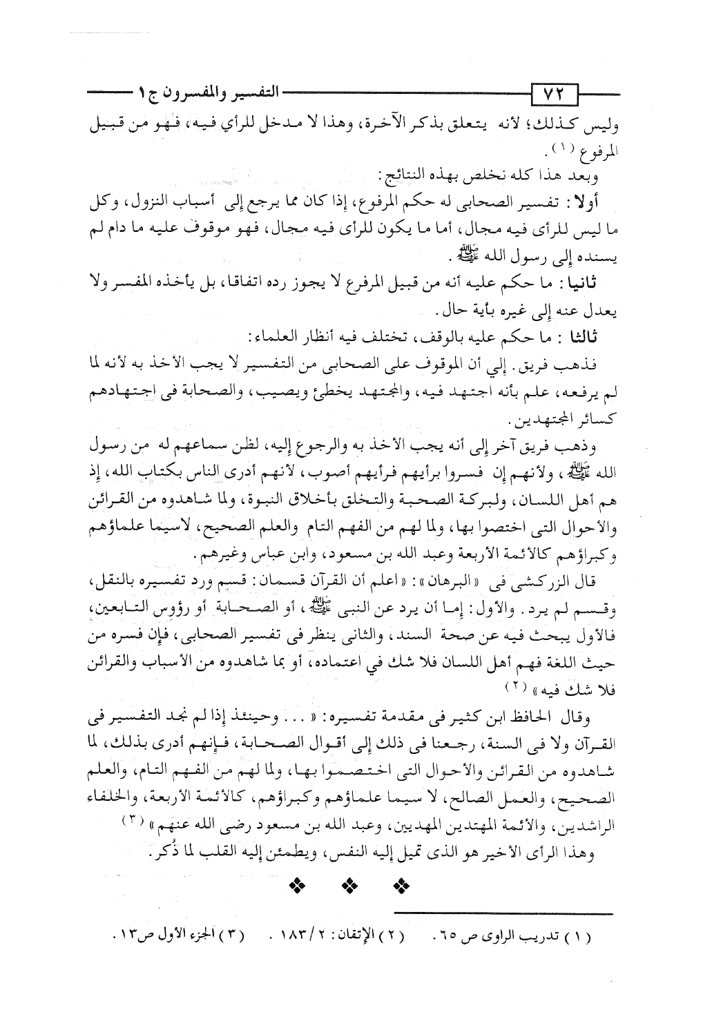 قال الزركشى فى "البرهان": "اعلم أن القرآن قسمان: قسم ورد تفسيره بالنقل، وقسم لم يرد. والأول: إما أن يرد عن النبى صلى الله عليه وسلم، أو الصحابة، أو رؤوس التابعين، فالأول يُبحث فيه عن صحة السند، والثانى يُنظر فى تفسير الصحابى، فإن فسَّره من حيث اللغة فهم أهل اللسان فلا شك فى اعتماده، أو بما شاهدوه من الأسباب والقرائن فلا شك فيه".