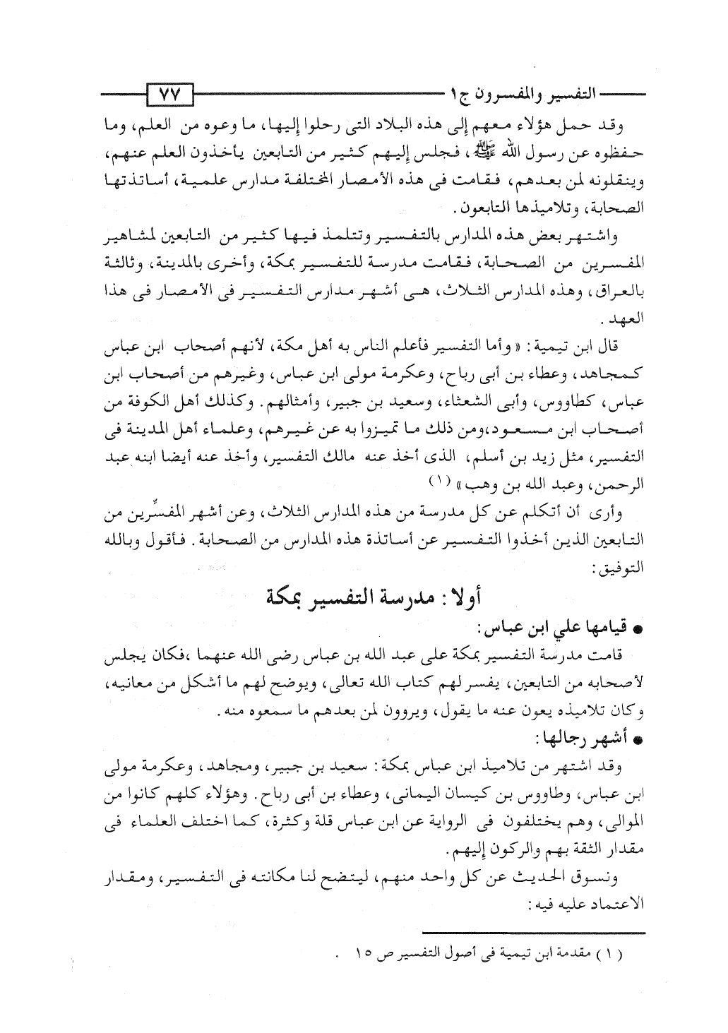 واشتهر بعض هذه المدارس بالتفسير، وتتلمذ فيها كثير من التابعين لمشاهير المفسِّرين من الصحابة، فقامت مدرسة للتفسير بمكة، وأخرى بالمدينة، وثالثة بالعراق، وهذه المدارس الثلاث، هى أشهر مدارس التفسير فى الأمصار فى هذا العهد.