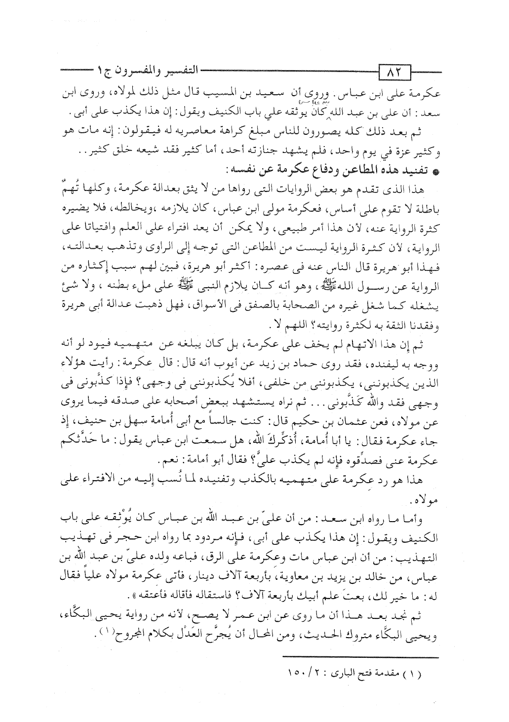 هذا الذى تقدَّم هو بعض الروايات التى رواها مَن لا يثق بعدالة عِكرمة، وكلها تهم باطلة لا تقوم على أساس، فعِكرمة مولى ابن عباس، كان يلازمه ويخالطه، فلا يضيره كثرة الرواية عنه لأن هذا أمر طبيعى، ولا يمكن أن يُعَد افتراءً على العلم وافتياتاً على الرواية، لأن كثرة الرواية ليست من المطاعن التى تُوجَّه إلى الراوى وتُذْهِب بعدالته، فهذا أبو هريرة قال الناس عنه فى عصره، أكثرَ أبو هريرة، فبيَّن لهم سبب إكثاره من الرواية عن رسول الله صلى الله عليه وسلم، وهو أنه كان يلازم النبى على ملء بطنه، ولا شئ يشغله كما شغل غيره من الصحابة بالصفق فى الأسواق، فهل ذهبت عدالة أبى هريرة وفقدنا الثقة به لكثرة روايته؟ اللَّهم لا.