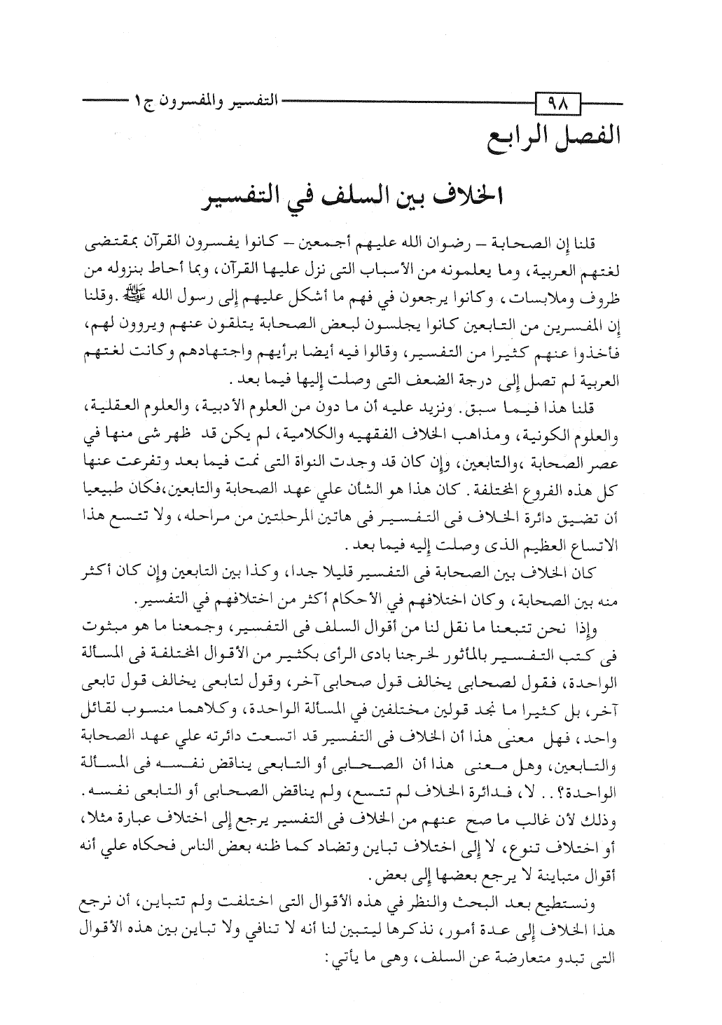قلنا هذا فيما سبق. ونزيد عليه أن ما دُوِّن من العلوم الأدبية، والعلوم العقلية، والعلوم الكونية، ومذاهب الخلاف الفقهية والكلامية، لم يكن قد ظهر شئ منها فى عصر الصحابة والتابعين، وإن كان قد وُجِدت النواة التى نمت فيما بعد وتفرَّعت عنها كل هذه الفروع المختلفة. كان هذا هو الشأن على عهد الصحابة والتابعين، فكان طبيعياً أن تضيق دائرة الخلاف فى التفسير فى هاتين المرحلتين من مراحله، ولا تتسع هذا الاتساع العظيم الذى وصلت إليه فيما بعد.