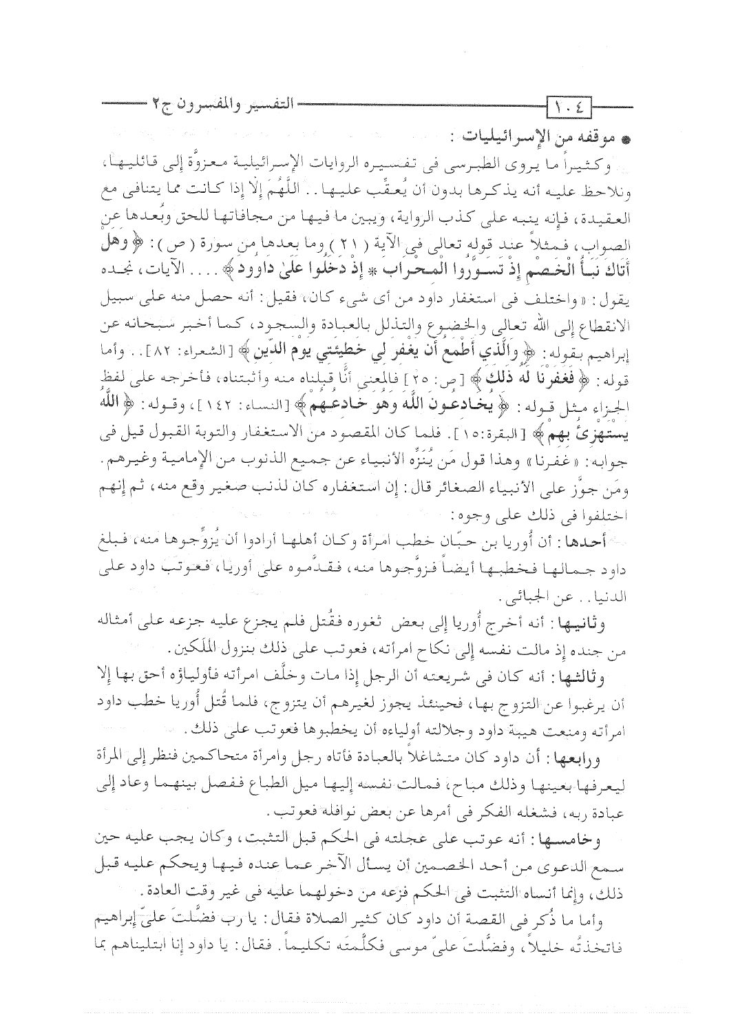 ورابعها: أن داود كان متشاغلاً بالعبادة فأتاه رجل وامرأة متحاكمين فنظر إلى المرأة ليعرفها بعينها وذلك مباح، فمالت نفسه إليها ميل الطباع ففصل بينهما وعاد إلى عبادة ربه، فشغله الفكر فى أمرها عن بعض نوافله فعوتب.