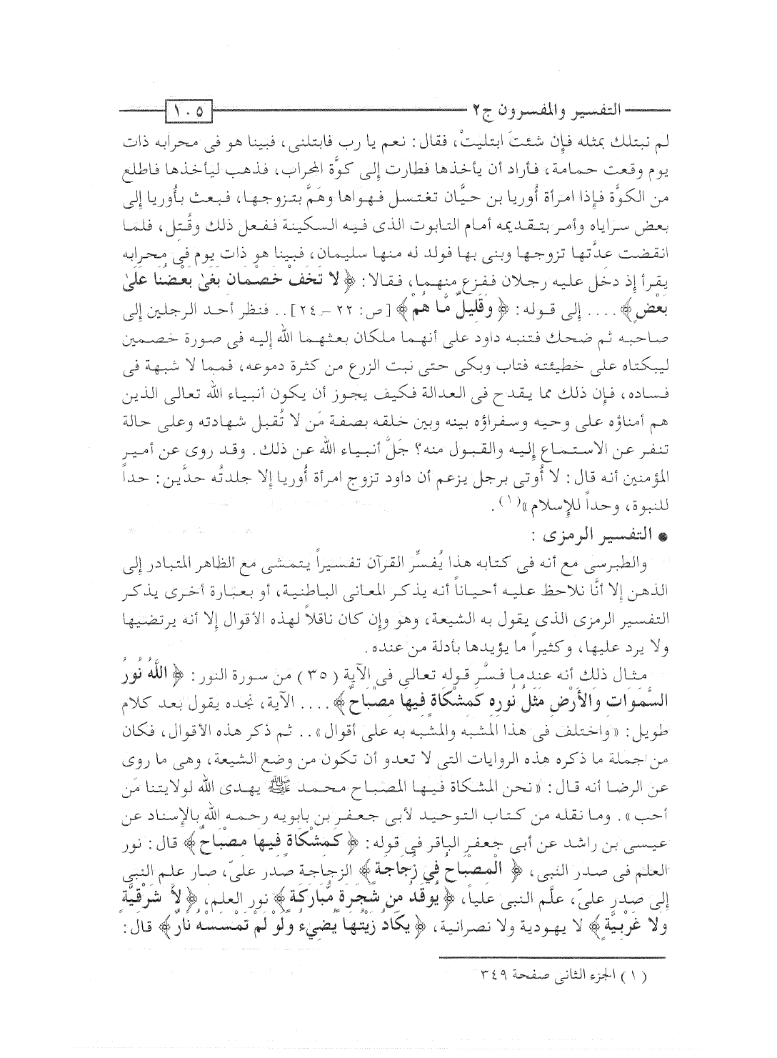 مثال ذلك أنه عندما فسَّر قوله تعالى فى الآية [35] من سورة النور: {الله نُورُ السماوات والأرض مَثَلُ نُورِهِ كَمِشْكَاةٍ فِيهَا مِصْبَاحٌ} ... الآية، نجده يقول بعد كلام طويل: "واختلف فى هذا المشبه والمشبه به على أقوال".. ثم ذكر هذه الأقوال، فكان من جملة ما ذكره هذه الروايات التى لا تعدو أن تكون من وضع الشيعة، وهى ما روى عن الرضا أنه قال: "نحن المشكاة فيها المصباح محمد صلى الله عليه وسلم يهدى الله لولايتنا من أحب". وما نقله من كتاب التوحيد لأبى جعفر بن بابويه رحمه الله بالإسناد عن عيسى بن راشد عن أبى جعفر الباقر فى قوله: {كَمِشْكَاةٍ فِيهَا مِصْبَاحٌ} قال: نور العلم فى صدر النبى، {المصباح فِي زُجَاجَةٍ الزجاجة} الزجاجة صدر علىّ، صار علم النبى إلى صدر علىّ، علَّم النبى علياً، {يُوقَدُ مِن شَجَرَةٍ مُّبَارَكَةٍ} نور العلم، {لاَّ شَرْقِيَّةٍ وَلاَ غَرْبِيَّةٍ} لا يهودية ولا نصرانية، {يَكَادُ زَيْتُهَا يضياء وَلَوْ لَمْ تَمْسَسْهُ نَارٌ} قال: