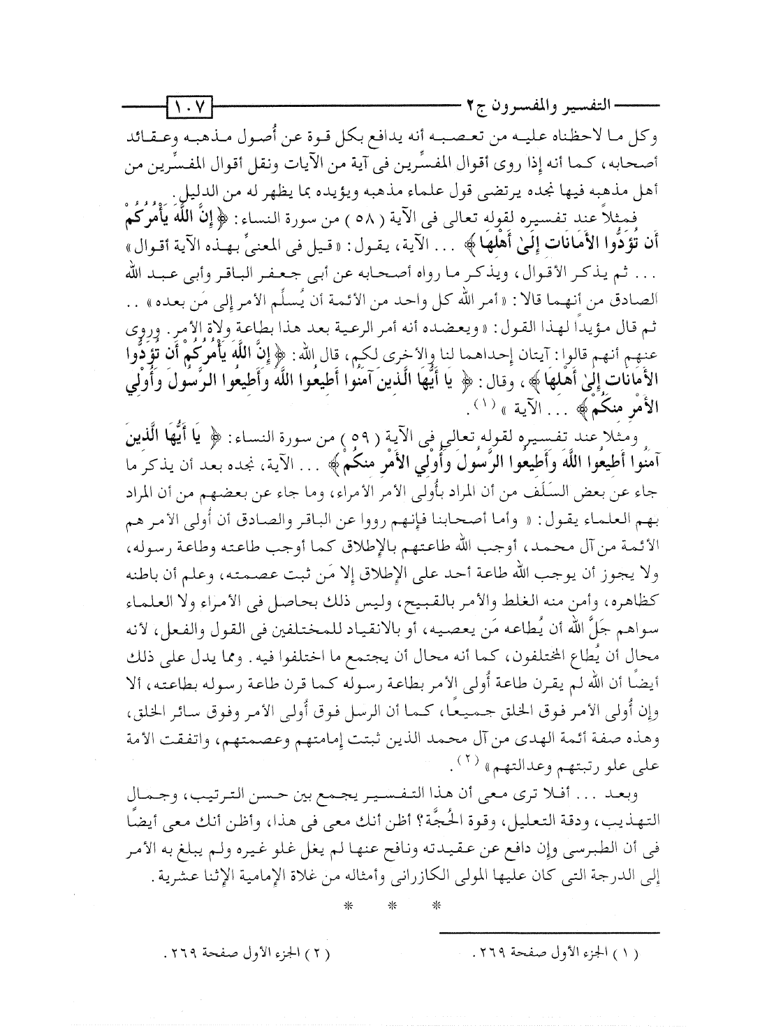 ومثلاً عند تفسيره لقوله تعالى فى الآية [59] من سورة النساء: {يَا أَيُّهَا الذين آمَنُواْ أَطِيعُواْ الله وَأَطِيعُواْ الرسول وَأُوْلِي الأمر مِنْكُمْ} .. الآية، نجده بعد أن يذكر ما جاء عن بعض السَلَف من أن المراد بأُولى الأمر الأمراء، وما جاء عن بعضهم من أن المراد بهم العلماء يقول: "وأما أصحابنا فإنهم رووا عن الباقر والصادق أن أُولى الأمر هم الأئمة من آل محمد، أوجب الله طاعتهم بالإطلاق كما أوجب طاعته وطاعة رسوله، ولا يجوز أن يوجب الله طاعة أحد على الإطلاق إلا مَن ثبت عصمته، وعلم أن باطنه كظاهره، وأمن منه الغلط والأمر بالقبيح، وليس ذلك بحاصل فى الأمراء ولا العلماء سواهم، جلَّ الله أن يُطاعه مَن يعصيه، أو بالانقياد للمختلفين فى القول والفعل، لأنه محال أن يُطاع المختلفون، كما أنه محال أن يجتمع ما اختلفوا فيه. ومما يدل على ذلك أيضاً أن الله لم يقرن طاعة أُولى الأمر بطاعة رسوله كما قرن طاعة رسوله بطاعته، ألا وإن أُولى الأمر فوق الخلق جميعاً، كما أن الرسل فوق أُولى الأمر وفوق سائر الخلق، وهذه صفة أئمة الهدى من آل محمد الذين ثبتت إمامتهم وعصمتهم، واتفقت الأمة على علو رتبتهم وعدالتهم".