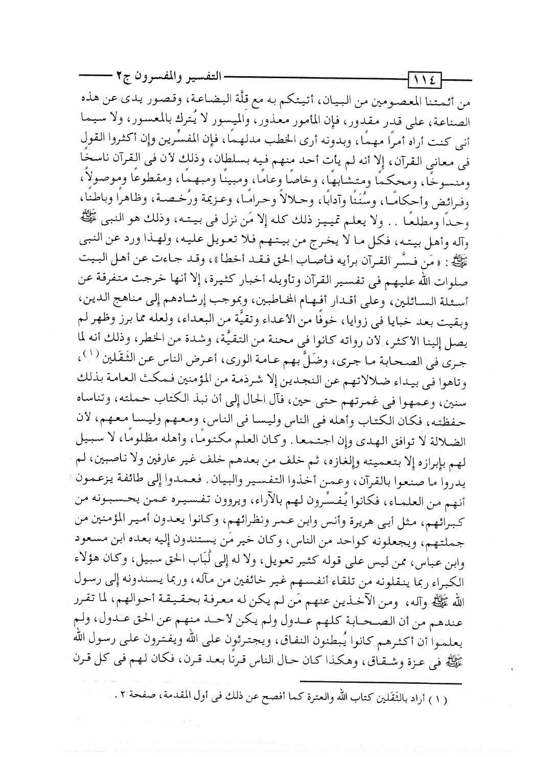 بالآراء، ويروون تفسيره عمن يحسبونه من كبرائهم، مثل أبى هريرة وأنس وابن عمر ونظرائهم، وكانوا يعدون أمير المؤمنين من جملتهم، ويجعلونه كواحد من الناس، وكان خير مَن يستندون إليه بعده ابن مسعود وابن عباس، ممن ليس على قوله كثير تعويل، ولا له إلى لُبَاب الحق سبيل، وكان هؤلاء الكبراء ربما ينقلونه من تلقاء أنفسهم غير خائفين من مآله، وربما يسندونه إلى رسول الله صلى الله عليه وسلم وآله، ومن الآخذين عنهم مَن لم يكن له معرفة بحقيقة أحوالهم، لما تقرر عندهم من أن الصحابة كلهم عدول ولم يكن لأحد منهم عن الحق عدول، ولم يعلموا أن أكثرهم كانوا يُبطنون النفاق، ويجترئون على الله ويفترون على رسول الله صلى الله عليه وسلم فى عزة وشقاق، وهكذا كان حال الناس قرناً بعد قرن، فكان لهم فى كل قرن