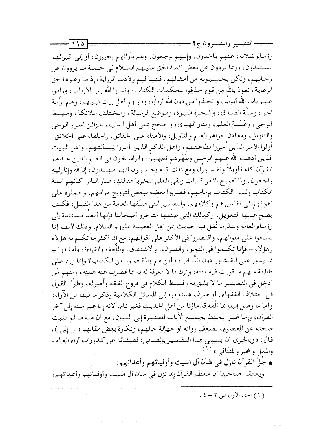رؤساء ضلالة، عنهم يأخذون، وإليهم يرجعون، وهم بآرائهم يجيبون، أو إلى كبرائهم يستندون، وربما يروون عن بعض أئمة الحق عليهم السلام فى جملة ما يروون عن رجالهم، ولكن يحسبونه من أمثالهم، فتباً لهم ولأدب الرواية، إذ ما رعوها حق الرعاية، نعوذ بالله من قوم حذفوا محكمات الكتاب، ونسوا الله رب الأرباب، وراموا غير باب الله أبواباً، واتخذوا من دون الله أرباباً، وفيهم أهل بيت نبيهم، وهم أزِّمة الحق، وسُنَّة الصدق، وشجرة النبوة، وموضع الرسالة، ومختلف الملائكة، ومهبط الوحى، وعَيْبة العلم، ومنار الهدى، والحجج على أهل الدنيا، خزائن أسرار الوحى والتنزيل، ومعادن جواهر العلم والتأويل، والأمناء على الحقائق، والخلفاء على الخلائق. أُولوا الأمر الذين أُمروا بطاعتهم، وأهل الذكر الذين أُمروا بمسألتهم، وأهل البيت الذين أذهب الله عنهم الرجس وطَهَّرهم تطهيراً، والراسخون فى العلم الذين عندهم القرآن كله تأويلاً وتفسيراً، ومع ذلك كله يحسبون أنهم مهتدون، إنا لله وإنا إليه راجعون. ولما أصبح الأمر كذلك وبقى العلم سخرياً هنالك، صار الناس كأنهم أئمة الكتاب وليس الكتاب بإمامهم، فضربوا بعضه ببعض لترويج مرامهم، وحملوه على أهوائهم فى تفاسيرهم وكلامهم، والتفاسير التى صنَّفها العامة من هذا القبيل، فكيف يصح عليها التعويل، وكذلك التى صنَّفها متأخرو أصحابنا