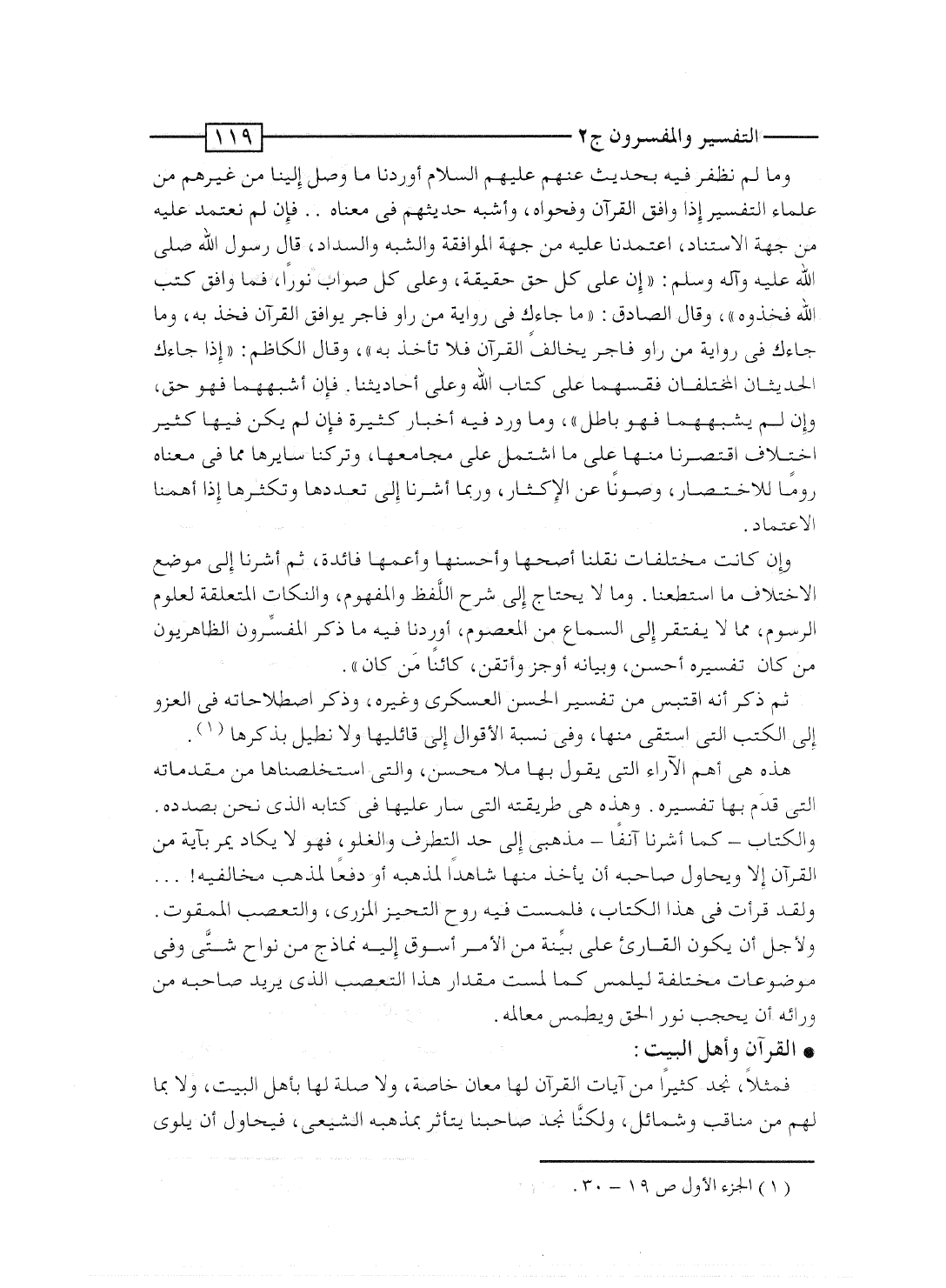 وما لم نظفر فيه بحديث عنهم عليهم السلام أوردنا ما وصل إلينا من غيرهم من علماء التفسير إذا وافق القرآن وفحواه، وأشبه حديثهم فى معناه.. فإن لم نعتمد عليه من جهة الاستناد، اعتمدنا عليه من جهة الموافقة والشبه والسداد، قال رسول الله صلى الله عليه وآله وسلم: "إن على كل حق حقيقة، وعلى كل صواب نوراً، فما وافق كتب الله فخذوه"، وقال الصادق: "ما جاءك فى رواية من راوٍ فاجر يوافق القرآن فخذ به، وما جاءك فى رواية من راوٍ فاجر يخالف القرآن فلا تأخذ به"، وقال الكاظم: "إذا جاءك الحديثان المختلفان فقسهما على كتاب الله وعلى أحاديثنا. فإن أشبههما فهو حق، وإن لم يشبهها فهو باطل"، وما ورد فيه أخبار كثيرة فإن لم يكن فيها كثير اختلاف اقتصرنا منها على ما اشتمل على مجامعها، وتركنا سايرها مما فى معناه روماً للاختصار، وصوناً عن الإكثار، وربما أشرنا إلى تعددها وتكثرها إذا أهمنا الاعتماد.