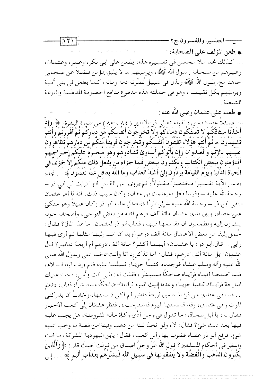 فمثلاً عند تفسيره لقوله تعالى فى الآيتين [84، 85] من سورة البقرة: {وَإِذْ أَخَذْنَا مِيثَاقَكُمْ لاَ تَسْفِكُونَ دِمَآءَكُمْ وَلاَ تُخْرِجُونَ أَنْفُسَكُمْ مِّن دِيَارِكُمْ ثُمَّ أَقْرَرْتُمْ وَأَنْتُمْ تَشْهَدُونَ * ثُمَّ أَنْتُمْ هاؤلاء تَقْتُلُونَ أَنْفُسَكُمْ وَتُخْرِجُونَ فَرِيقاً مِّنْكُمْ مِّن دِيَارِهِمْ تَظَاهَرُونَ عَلَيْهِمْ بالإثم وَالْعُدْوَانِ وَإِن يَأتُوكُمْ أسارى تُفَادُوهُمْ وَهُوَ مُحَرَّمٌ عَلَيْكُمْ إِخْرَاجُهُمْ أَفَتُؤْمِنُونَ بِبَعْضِ الكتاب وَتَكْفُرُونَ بِبَعْضٍ فَمَا جَزَآءُ مَن يَفْعَلُ ذلك مِنكُمْ إِلاَّ خِزْيٌ فِي الحياة الدنيا وَيَوْمَ القيامة يُرَدُّونَ إلى أَشَدِّ العذاب وَمَا الله بِغَافِلٍ عَمَّا تَعْمَلُونَ} .. نجده يفسر الآية تفسيراً مختصراً مقبولاً، ثم يروى عن القُمِّى: "أنها نزلت فى أبى ذر - رحمة الله عليه - وفيما فعل به عثمان بن عفان، وكان سبب ذلك: أنه لما أمر عثمان بنفى أبى ذر - رحمة الله عليه - إلى الرِبْذة، دخل عليه أبو ذر وكان عليلاً وهو متكئ على عصاه، وبين يدى عثمان مائة ألف درهم أتته من بعض النواحى، وأصحابه حوله ينظرون إليه ويطعمون أن يقسمها فيهم، فقال أبو ذر لعثمان: ما هذا المال؟ فقال: حُمِل إلينا من بعض الأعمال مائة ألف درهم أريد أن أضم إليها مثلها ثم أرى فيها رأيى.. قال أبو ذر: يا عثمان؛ أيما أكثر؟ مائة ألف درهم أم أربعة دنانير؟ قال عثمان: بل مائة ألف درهم، فقال: أما تذكر إذ أنا وأنت دخلنا على رسول الله صلى الله عليه وسلم عِشاءً فوجدناه كئيباً حزيناً، فسلَّمنا عليه فلم يرد علينا السلام، فلما أصبحنا أتيناه فرأيناه ضاحكاً مستبشراً، فقلت له: بأبى أنت وأُمى، دخلنا عليك البارحة فرأيناك كئيباً حزيناً، وعدنا إليك اليوم فرأيناك ضاحكاً مستبشراً، فقال: "نعم.. قد بقى عندى من فئ المسلمين أربعة دنانير لم أكن قسمتها، وخِفتُ أن يدركنى الموت وهى عندى، وقد قسمتها اليوم فاسترحت". فنظر عثمان إلى كعب الأحبار فقال له: يا أبا إسحاق؛ ما تقول فى رجل أدَّى زكاة ماله المفروضة، هل يجب عليه فيها بعد ذلك شئ؟ فقال: لا، ولو اتخذ لبنة من ذهب ولبنة من