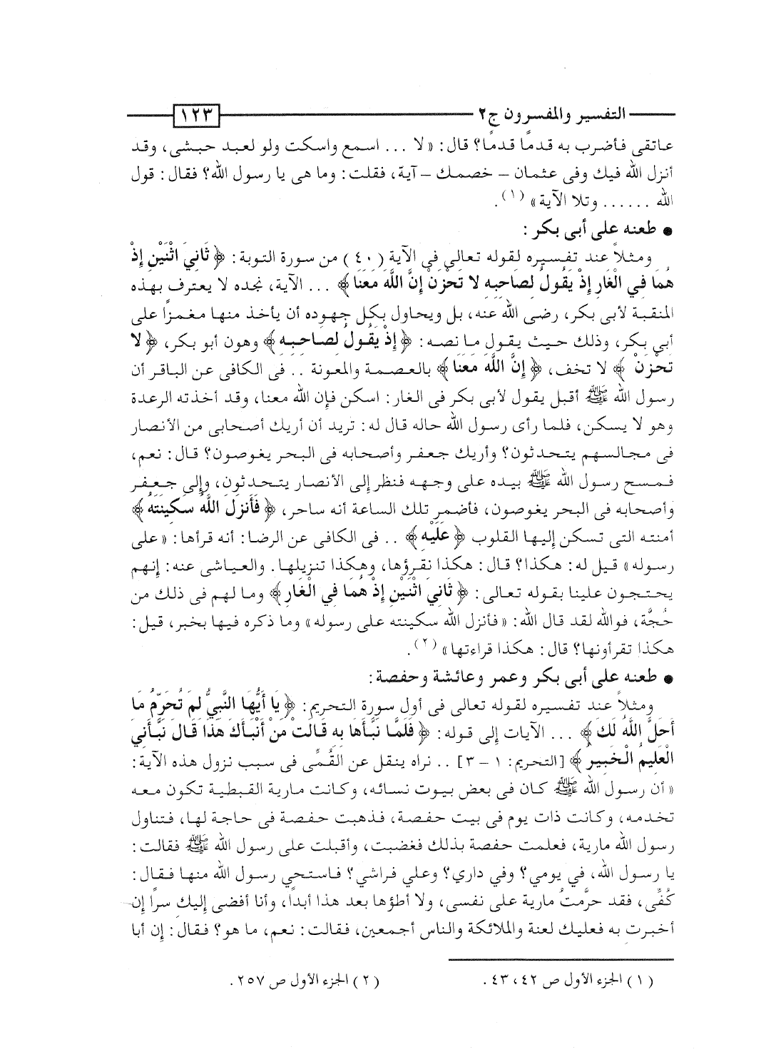 ومثلاً عند تفسيره لقوله تعالى فى الآية [40] من سورة التوبة: {ثَانِيَ اثنين إِذْ هُمَا فِي الغار إِذْ يَقُولُ لِصَاحِبِهِ لاَ تَحْزَنْ إِنَّ الله مَعَنَا} ... الآية، نجده لا يعترف بهذه المنقبة لأبى بكر، رضى الله عنه، بل ويحاول بكل جهوده أن يأخذ منها مغمزاً على أبى بكر، وذلك حيث يقول ما نصه: {إِذْ يَقُولُ لِصَاحِبِهِ} وهو أبو بكر، {لاَ تَحْزَنْ} لا تخف، {إِنَّ الله مَعَنَا} بالعصمة والمعونة.. فى الكافى عن الباقر أن رسول الله صلى الله عليه وسلم أقبل يقول لأبى بكر فى الغار: اسكن فإن الله معنا، وقد أخذته الرعدة وهو لا يسكن، فلما رأى رسول الله حاله قال له: تريد أن أريك أصحابى من الأنصار فى مجالسهم يتحدثون؟ وأريك جعفر وأصحابه فى البحر يغوصون؟ قال: نعم، فمسح رسول الله صلى الله عليه وسلم بيده على وجهه فنظر إلى الأنصار يتحدثون، وإلى جعفر وأصحابه فى البحر يغوصون، فأضمر تلك الساعة أنه ساحر، {فَأَنزَلَ الله سَكِينَتَهُ} أمنته التى تسكن إليها القلوب {عَلَيْهِ} .. فى الكافى عن الرضا: أنه قرأها: "على رسوله" قيل له: هكذا؟ قال: هكذا نقرؤها، وهكذا تنزيلها. والعياشى عنه: إنهم يحتجون علينا بقوله تعالى: {ثَانِيَ اثنين إِذْ هُمَا فِي الغار} وما لهم فى ذلك من حُجَّة، فوالله لقد قال الله: "فأنزل الله سكينته على رسوله" وما ذكره فيها بخبر، قَيل: هكذا تقرأونها؟ قال: هكذا قراءتها".
