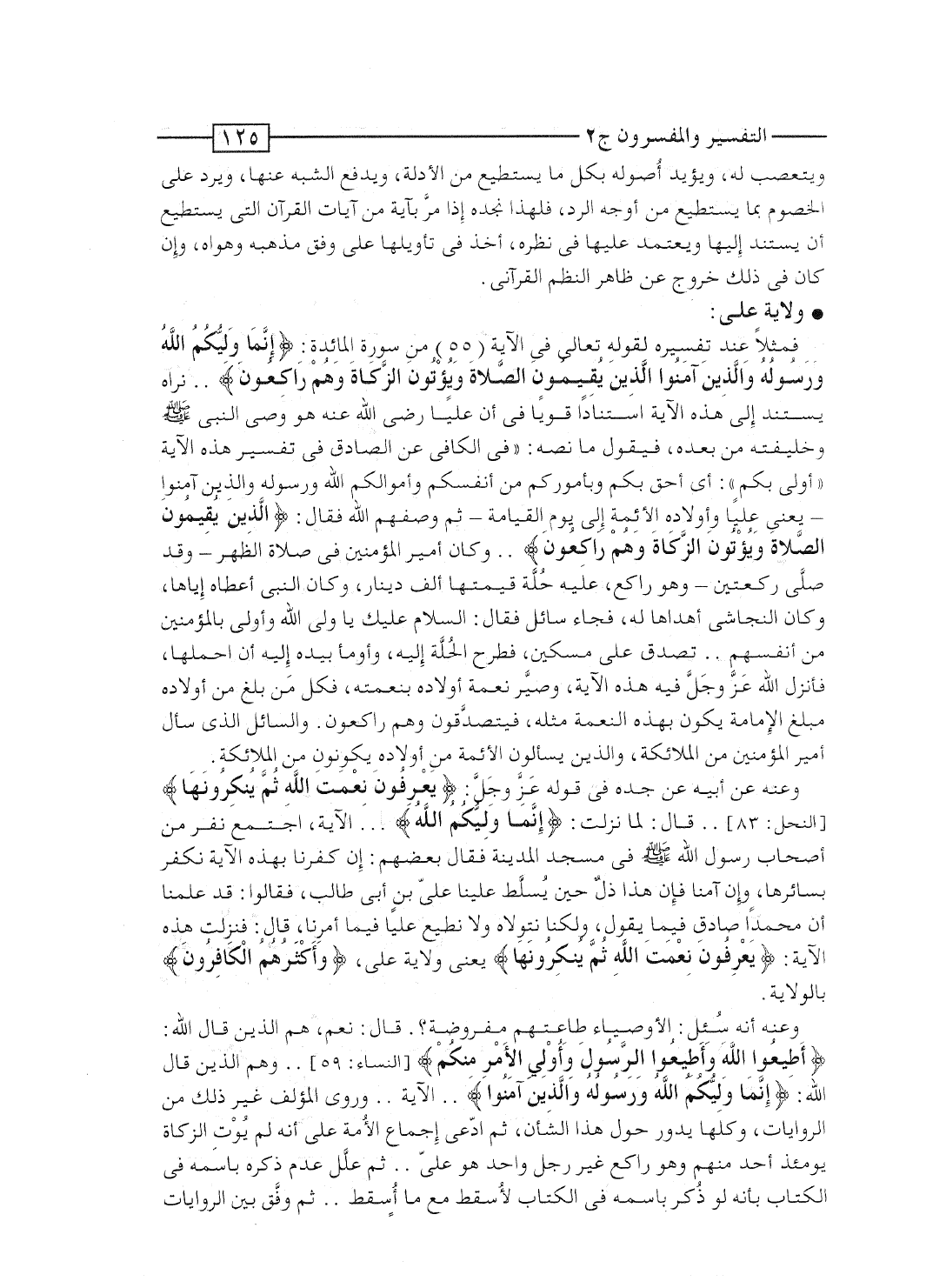 فمثلاً عند تفسيره لقوله تعالى فى الآية [55] من سورة المائدة: {إِنَّمَا وَلِيُّكُمُ الله وَرَسُولُهُ والذين آمَنُواْ الذين يُقِيمُونَ الصلاة وَيُؤْتُونَ الزكاة وَهُمْ رَاكِعُونَ} .. نراه يستند إلى هذه الآية استناداً قوياً فى أن علياً رضى الله عنه هو وصى النبى صلى الله عليه وسلم وخليفته من بعده، فيقول ما نصه: "فى الكافى عن الصادق فى تفسير هذه الآية "أولى بكم": أى أحق بكم وبأموركم من أنفسكم وأموالكم الله ورسوله والذين آمنوا - يعنى علياً وأولاده الأئمة إلى يوم القيامة - ثم وصفهم الله فقال: {الذين يُقِيمُونَ الصلاة وَيُؤْتُونَ الزكاة وَهُمْ رَاكِعُونَ} .. وكان أمير المؤمنين فى صلاة الظهر - وقد صلَّى ركعتين - وهو راكع، عليه حُلَّة قيمتها ألف دينار، وكان النبى أعطاه إياها، وكان النجاشى أهداها له، فجاء سائل فقال: السلام عليك يا ولى الله وأولى المؤمنين من أنفسهم.. تصدق على مسكين، فطرح الحُلَّة إليه، وأومأ بيده إليه أن احملها، فأنزل الله عَزَّ وجَلَّ فيه هذه الآية، وصيَّر نعمة أولاده بنعمته، فكل مَن بلغ من أولاده مبلغ الإمامة يكون بهذه النعمة مثله، فيتصدَّقون وهم راكعون. والسائل الذى سأل أمير المؤمنين من الملائكة، والذين يسألون الأئمة من أولاده يكونون من الملائكة.