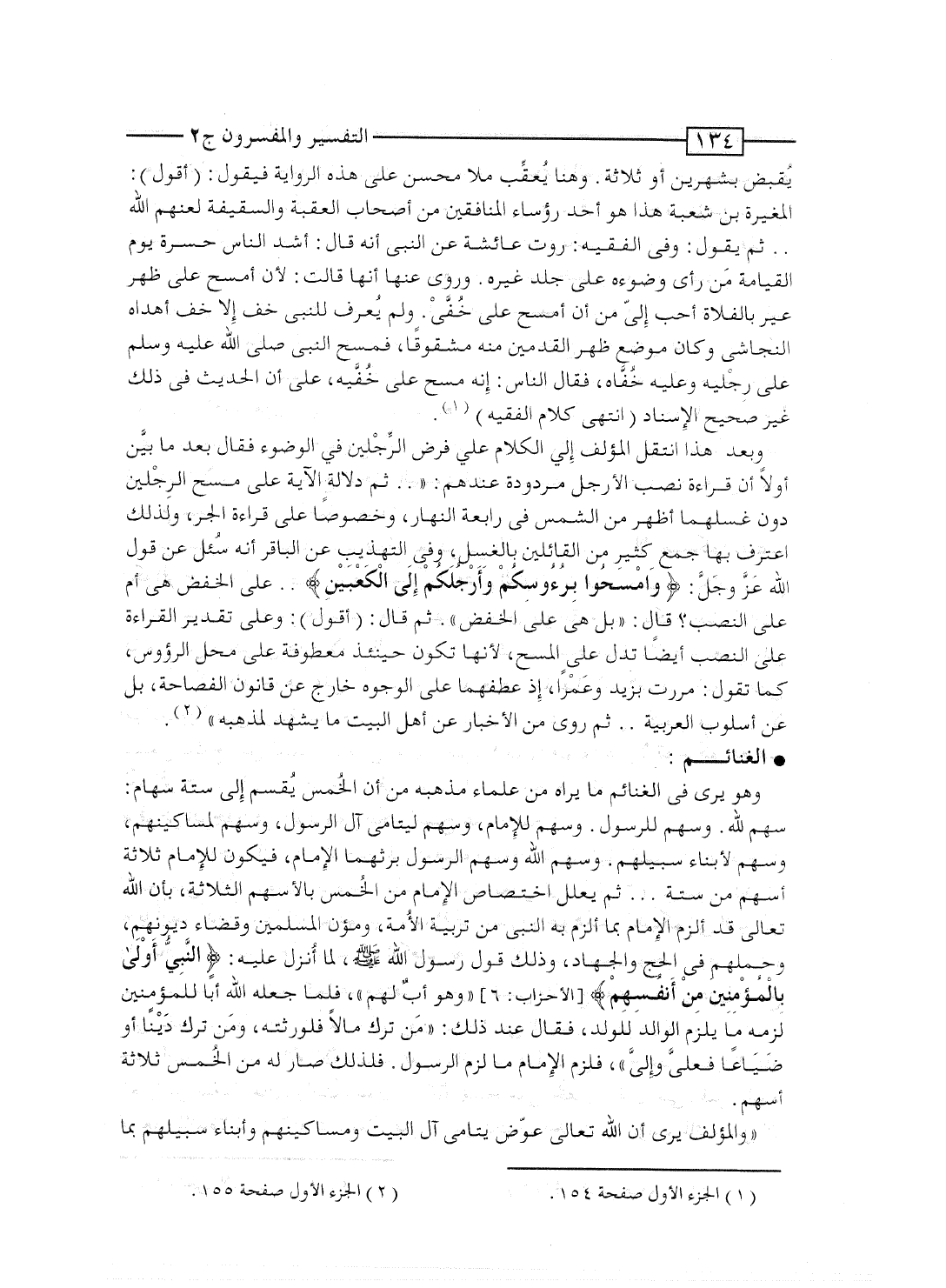 وبعد هذا انتقل المؤلف إلى الكلام على فرض الرِجْلين فى الوضوء، فقال بعد ما بيَّن أولاً أن قراءة نصب الأرجل مردودة عندهم: ".. ثم دلالة الآية على مسح الرِجْلين دون غسلهما أظهر من الشمس فى رابعة النهار، وخصوصاً على قراءة الجر، ولذلك اعترف بها جمع كثير من القائلين بالغسل، وفى التهذيب عن الباقر أنه سُئل عن قول الله عَزَّ وجَلَّ: {وامسحوا بِرُؤُوسِكُمْ وَأَرْجُلَكُمْ إِلَى الكعبين} .. على الخفض هى أم على النصب؟ قال: "بل هى على الخفض"، ثم قال: (أقول) : وعلى تقدير القراءة على النصب أيضاً تدل على المسح، لأنها تكون حينئذ معطوفة على محل الرؤوس، كما تقول: مررت بزيد وعَمْراً، إذ عطفهما على الوجوه خارج عن قانون الفصاحة، بل عن أسلوب العربية.. ثم روى من الأخبار عن أهل البيت ما يشهد لمذهبه".