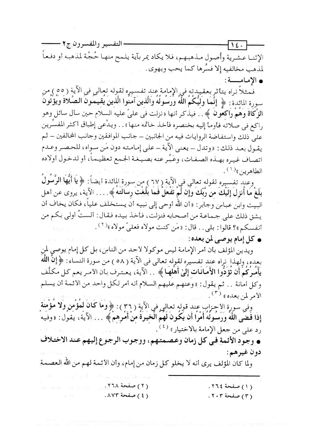 ويدين المؤلف بأن الأمر الإمامة ليس موكولاً لأحد من الناس، بل كل إمام يوصى لمن بعده، ولهذا نراه عند تفسيره لقوله تعالى فى الآية [58] من سورة النساء: {إِنَّ الله يَأْمُرُكُمْ أَن تُؤدُّواْ الأمانات إلى أَهْلِهَا} .. الآية، يعترف بأن الأمر يعم كل مكلَّف وكل أمانة.. ثم يقول: "وعنهم عليهم السلام أنه أمر لكل واحد من الأئمة أن يسلم الأمر لمن بعده".