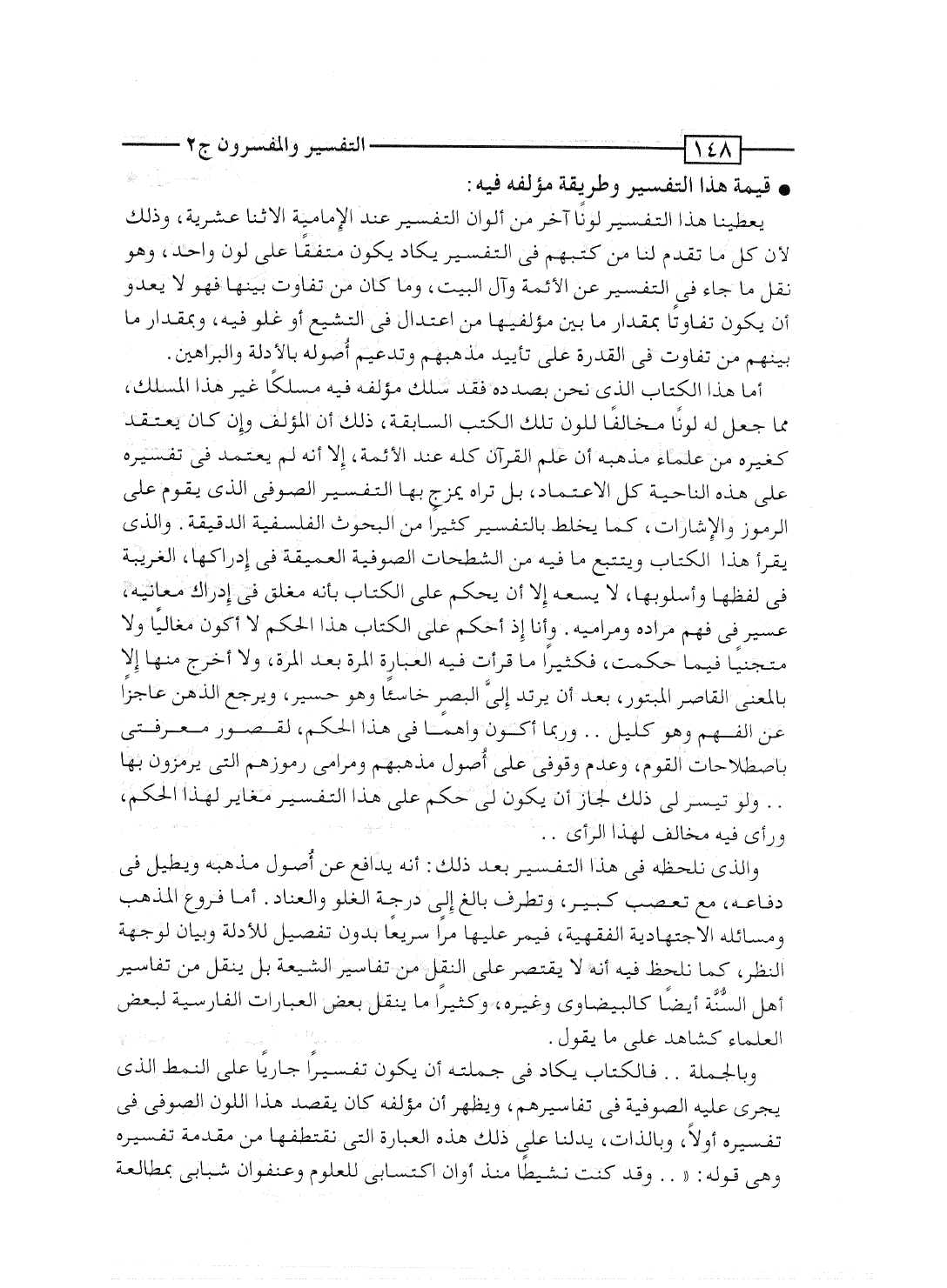 أما هذا الكتاب الذى نحن بصدده فقد سلك مؤلفه فيه مسلكاً غير هذا المسلك، مما جعل له لوناً مخالفاً للون تلك الكتب السابقة، ذلك أن المؤلف وإن كان يعتقد كغيره من علماء مذهبه أن علم القرآن كله عند الأئمة، إلا أنه لم يعتمد فى تفسيره على هذه الناحية كل الاعتماد، بل تراه يمزج بها التفسير الصوفى الذى يقوم على الرموز والإشارات، كما يخلط بالتفسير كثيراً من البحوث الفلسفية الدقيقة. والذى يقرأ هذا الكتاب ويتتبع ما فيه من الشطحات الصوفية العميقة فى إدراكها، الغريبة فى لفظها وأسلوبها، لا يسعه إلا أن يحكم على الكتاب بأنه مغلق فى إدراك معانيه، عسير فى فهم مراده ومراميه. وأنا إذ أحكم على الكتاب هذا الحكم لا أكون مغالياً ولا متجنياً فيما حكمت، فكثيراً ما قرأت فيه العبارة المرة بعد المرة، ولا أخرج منها إلا بالمعنى القاصر المبتور، بعد أن يرتد إلىَّ البصر خاسئاً وهو حسير، ويرجع الذهن عاجزاً عن الفهم وهو كليل.. وربما أكون واهماً فى هذا الحكم، لقصور معرفتى باصطلاحات القوم، وعدم وقوفى على أُصول مذهبهم ومرامى رموزهم التى يرمزون بها.. ولو تيسر لى ذلك لجاز أن يكون لى حكم على هذا التفسير مغاير لهذا الحكم، ورأى فيه مخالف لهذا الرأى..