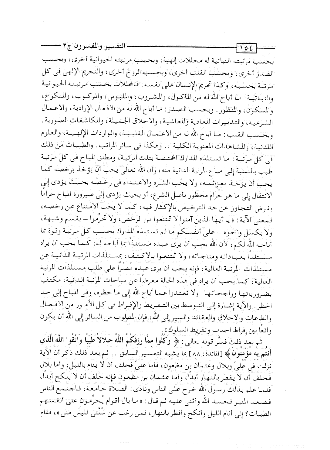 ثم بعد ذلك فسَّر قوله تعالى: {وَكُلُواْ مِمَّا رَزَقَكُمُ الله حَلاَلاً طَيِّباً واتقوا الله الذي أَنتُم بِهِ مُؤْمِنُونَ} [المائدة: 88] بما يشبه التفسير السابق.. ثم بعد ذلك ذكر أن الآية نزلت فى علىّ وبلال وعثمان بن مظعون، فأما علىّ فحلف أن لا ينام بالليل، وأما بلال فحلف أن لا يفطر بالنهار أبداً، وأما عثمان ابن مظعون فإنه حلف أن لا ينكح أبداً، فلما علم بذلك رسول الله خرج على الناس ونادى: الصلاة جامعة، فاجتمع الناس فصعد المنبر فحمد الله وأثنى عليه ثم قال: "ما بال أقوام يُحرِّمون على أنفسهم الطيبات؟ إنى أنام الليل وأنكح وأفطر بالنهار، فمن رغب عن سُنَّتى فليس منى"، فقام