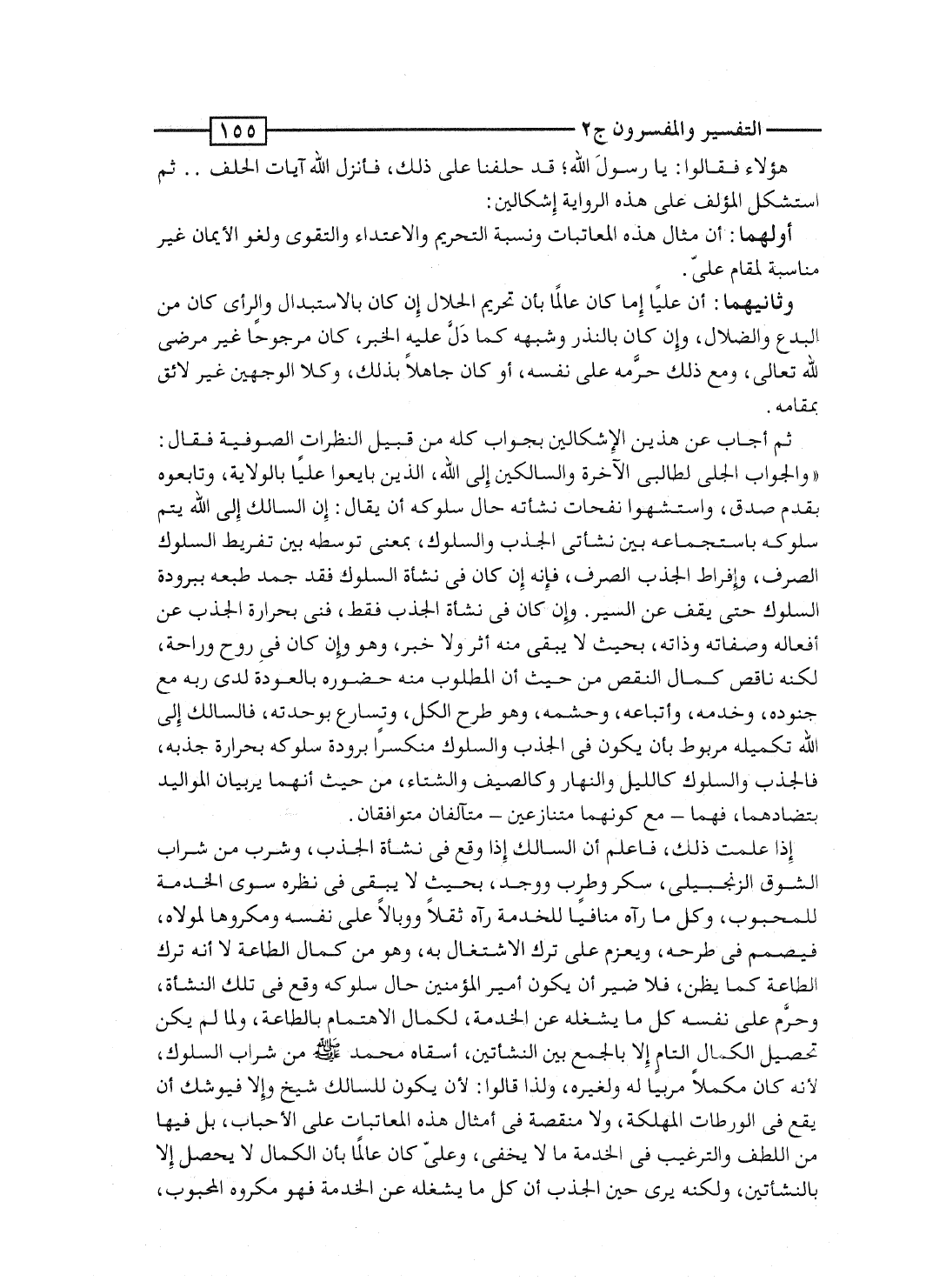 إذا علمت ذلك، فاعلم أن السالك إذا وقع فى نشأة الجذب، وشرب من شراب الشوق الزنجبيلى، سكر وطرب ووجد، بحيث لا يبقى فى نظره سوى الخدمة للمحبوب، وكل ما رآه منافياً للخدمة رآه ثقلاً ووبالاً على نفسه ومكروهاً لمولاه، فيصمم فى طرحه، ويعزم على ترك الاشتغال به، وهو من كمال الطاعة لا أنه ترك الطاعة كما يظن، فلا ضير أن يكون أمير المؤمنين حال سلوكه وقع فى تلك النشأة، وحرَّم على نفسه كل ما يشغله عن الخدمة، لكمال الاهتمام بالطاعة، ولما لم يكن تحصيل الكمال التام إلا بالجمع بين النشأتين، أسقاه محمد صلى الله عليه وسلم من شراب السلوك، لأنه كان مكملاً مربياً له ولغيره، ولذا قالوا: لأن يكون للسالك شيخ وإلا فيوشك أن يقع فى الورطات المهلكة، ولا منقصة فى أمثال هذه المعاتبات على الأحباب، بل فيها من اللطف والترغيب فى الخدمة ما لا يخفى، وعلىّ كان عالماً بأن الكمال لا يحصل إلا بالنشأتين، لكنه يرى حين الجذب أن كل ما يشغله عن الخدمة فهو مكروه المحبوب،