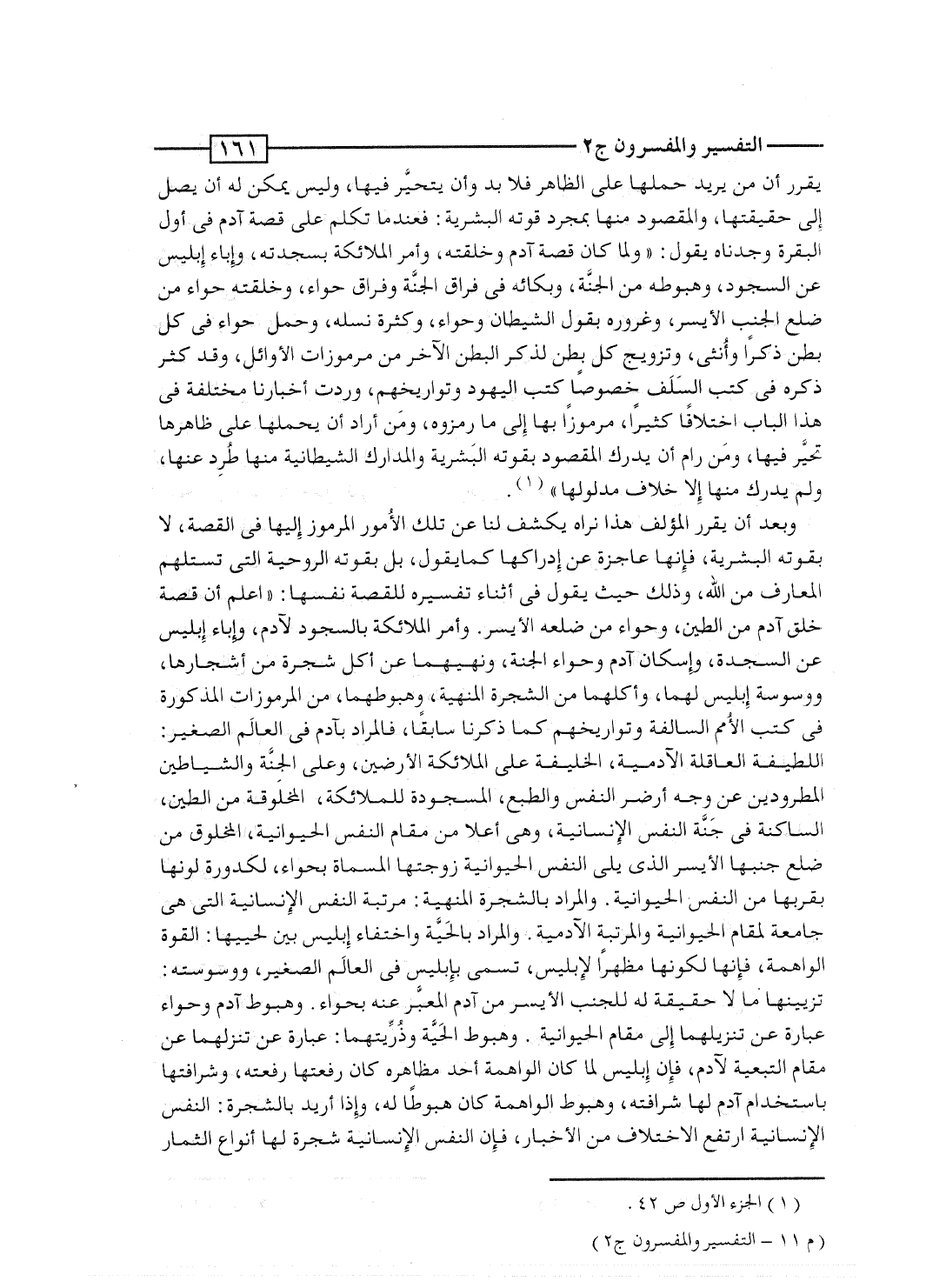 وبعد أن يقرر المؤلف هذا نراه يكشف لنا عن تلك الأُمور المرموز إليها فى القصة، لا بقوته البشرية، فإنها عاجزة عن إدراكها كما يقول، بل بقوته الروحية التى تستلهم المعارف من الله، وذلك حيث يقول فى أثناء تفسيره للقصة نفسها: "اعلم أن قصة خلق آدم من الطين، وحواء من ضلعه الأيسر. وأمر الملائكة بالسجود لآدم، وإباء إبليس عن السجدة، وإسكان آدم وحواء الجنة، ونهيهما عن أكل شجرة من أشجارها، ووسوسة إبليس لهما، وأكلهما من الشجرة المنهية، وهبوطهما، من المرموزات المذكورة فى كتب الأُمم السالفة وتواريخهم كما ذكرنا سابقاً، فالمراد بآدم فى العالَم الصغير: اللطيفة العاقلة الآدمية، الخليفة على الملائكة الأرضيين، وعلى الجِنَّة والشياطين المطرودين عن وجه أرض النفس والطبع، المسجودة للملائكة، المخلوقة من الطين، الساكنة فى جنَّة النفس الإنسانية، وهى أعلا من مقام النفس الحيوانية، المخلوق من ضلع جنبها الأيسر الذى يلى النفس الحيوانية زوجتها المسماة بحواء، لكدورة لونها بقربها من النفس الحيوانية. والمراد بالشجرة المنهية: مرتبة النفس الإنسانية التى هى جامعة لمقام الحيوانية والمرتبة الآدمية. والمراد بالحيَّة واختفاء إبليس بين لحييها: القوة الواهمة، فإنها لكونها مظهراً لإبليس، تسمى بإبليس فى العالَم الصغير، ووسوسته: تزيينها ما لا حقيقة له للجنب الأيسر من آدم المغبَّر عنه بحواء. وهبوط آدم وحواء عبارة عن تنزيلهما إلى مقام الحيوانية. وهبوط الحيَّة وذُرِّيتهما: عبارة عن تنزلهما عن مقام التبعية لآدم، فإن إبليس لما كان الواهمة أحد مظاهره كان رفعتها رفعته، وشرافتها باستخدام آدم لها شرافته، وهبوط الواهمة كان هبوطاً له، وإذا أريد بالشجرة: النفس الإنسانية ارتفع الاختلاف من الأخبار، فإن النفس الإنسانية شجرة لها أنواع الثمار