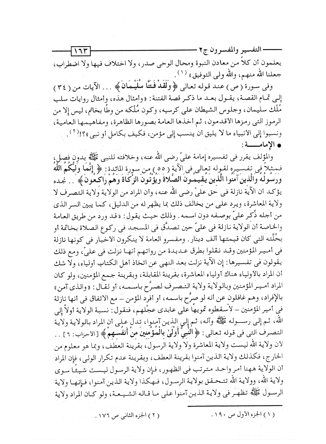 والمؤلف يقرر فى تفسيره إمامة علىّ رضى الله عنه، وخلافته للنبى صلى الله عليه وسلم بدون فصل، فمثلاً فى تفسيره لقوله تعالى فى الآية [55] من سورة المائدة: {إِنَّمَا وَلِيُّكُمُ الله وَرَسُولُهُ والذين آمَنُواْ الذين يُقِيمُونَ الصلاة وَيُؤْتُونَ الزكاة وَهُمْ رَاكِعُونَ} .. نجده يؤكد أن الآية نازلة فى حق علىّ رضى الله عنه، وأن المراد من الولاية ولاية التصرف لا ولاية المعاشرة، ويرد على مَن يخالف ذلك بما يظهر له من الدليل، كما يبين السر الذى من أجله ذُكِر علىّ بوصفه دون اسمه. وذلك حيث يقول: "قد ورد من طريق العامة والخاصة أن الولاية نازلة فى علىّ حين تصدَّق فى المسجد فى ركوع الصلاة بخاتمه أو بحُلَّته التى كان قيمتها ألف دينار، ومفسرو العامة لا ينكرون الأخبار فى كونها نازلة فى أمير المؤمنين وقد نقلوا بطرق عديدة من رواتهم أنها نزلت فى علىّ، ومع ذلك يقولون فى تفسيرها: إن الآية نزلت بعد النهى عن اتخاذ أهل الكتاب أولياء، ولا شك أن المراد بالأولياء هناك أولياء المعاشرة، بقرينة المقابلة، وبقرينة جمع المؤمنين، ولو كان المراد أمير المؤمنين وبالولاية ولاية التصرف لصرَّح باسمه، أو لقال: "والذى آمن" بالإفراد، وهم غافلون عن أنه لو صرَّح باسمه، أو أفرد المؤمن - مع الاتفاق فى أنها نازلة فى أمير المؤمنين - لأسقطوه تمويهاً على عابدى عِجْلهم، فنقول: نسبة الولاية أولاً إلى الله، ثم إلى رسوله صلى الله عليه وسلم وآله، ثم إلى الذين آمنوا، تدل على أن المراد بالولاية ولاية التصرف التى فى قوله تعالى: {النبي أولى بالمؤمنين مِنْ أَنْفُسِهِمْ} [الأحزاب: 6] .. لأن ولاية الله ليست ولاية المعاشرة ولا ولاية الرسول، بقرينة العطف، وبما هو معلوم من الخارج، فكذلك ولاية الذين آمنوا بقرينة العطف، وبقرينة عدم تكرار الولى، فإن المراد أن الولاية ههنا أمر واحد مترتب فى الظهور، فإن ولاية الرسول ليست شيئاً سوى ولاية الله، وولاية الله تتحقق بولاية الرسول، فهكذا ولاية الذين آمنوا، فإنها ولاية الرسول صلى الله عليه وآله وسلم تظهر فى ولاية الذين آمنوا على ما قاله الشيعة، ولو كان المراد ولاية