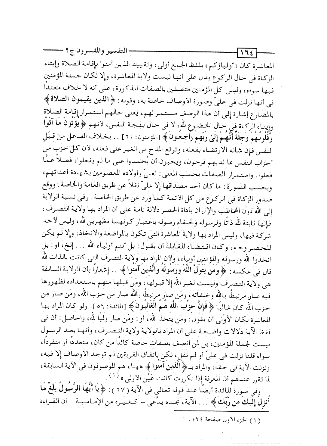المراد بالولاية ولاية التصرف، وأنها بعد الرسول ليست لجملة المؤمنين، بل لمن اتصف بصفات خاصة كائناً مَن كان، متعدداً أو منفرداً، سواء قلنا نزلت فى علىّ أو لم نقل، لكن باتفاق الفريقين لم توجد الأوصاف إلا فيه، ونزلت الآية فى حقه، والمراد بـ {الذين آمَنُواْ} ههنا، هم الموصوفون فى الآية السابقة، لما تقرر عندهم أن المعرفة إذا تكررت كانت عَيْن الأولى".