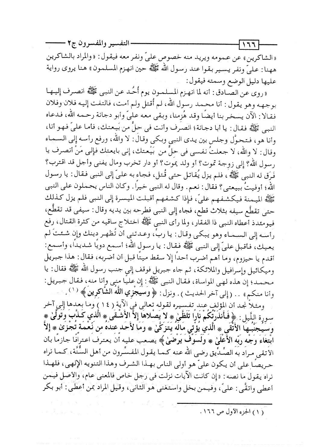 "روى عن الصادق: أنه لما انهزم المسلمون يوم أُحُد عن النبى صلى الله عليه وسلم انصرف إليها بوجهه وهو يقول: أنا محمد رسول الله، لم أُقتل ولم أمت، فالتفت إليه فلان وفلان فقالا: الآن يسخر بنا أيضاً وقد هُزِمنا، وبقى معه علىّ وأبو دجانة رحمه الله، فدعاه النبى صلى الله عليه وسلم فقال: يا أبا دجانة؟ انصرف وأنت فى حِلَّ من بَيْعتك، فأما علىّ فهو أنا، وأنا هو، فتحوَّل وجلس بين يدى النبى وبكى وقال: لا واللهِ، ورفع رأسه إلى السماء وقال: لا واللهِ، لا جعلتُ نفسى فى حِلٍّ من بَيْعتك، إنى بايعتك فإلى مَنْ انصرف يا رسول الله؟ إلى زوجة تموت؟ أو ولد يموت؟ أو دار تخرب ومال يفنى وأجل قد اقترب؟ فَرَق له النبى صلى الله عليه وسلم، فلم يزل يُقاتل حتى قُتل، فجاء به علىّ إلى النبى فقال: يا رسول الله؛ أوفيتُ ببيعتى؟ فقال: نعم. وقال له النبى خيراً. وكان الناس يحملون على النبى صلى الله عليه وسلم الميمنة فيكشفهم علىّ، فإذا كشفهم أقبلت الميسرة إلى النبى فلم يزل كذلك حتى تقطَّع سيفه بثلاث قطع، فجاء إلى النبى فطرحه بين يديه وقال: سيفى قد تقطَّع، فيومئذ أعطاه النبى ذا الفقار، ولما رأى النبى صلى الله عليه وسلم اختلاج ساقيه من كثرة القتال، رفع رأسه إلى السماء وهو ويبكى وقال: يا ربِّ، وعدتنى أن تُظهر دينك وإن شئتَ لم يعيك، فأقبل علىّ إلى النبى صلى الله عليه وسلم فقال: يا رسول الله؛ أسمع دوياً شديداً، وأسمع: أقدم يا حيزوم، وما أهم أضرب أحداً إلا سقط ميتاً قبل أن أضربه، فقال: هذا جبريل وميكائيل وإسرافيل والملائكة، ثم جاء جبريل فوقف إلى جنب رسول الله صلى الله عليه وسلم فقال: يا محمد؛ إن هذه لهى المواساة، فقال النبى صلى الله عليه وسلم: إن علياً منى وأنا منه، فقال جبريل: وأنا منكم".. (إلى آخر الحديث) . ونزل: {وَسَيَجْزِي الله الشاكرين} .
