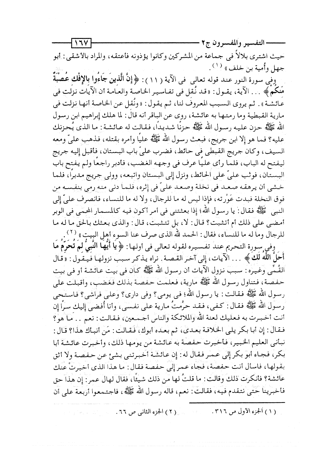 وفى سورة النور عند قوله تعالى فى الآية [11] : {إِنَّ الذين جَآءُوا بالإفك عُصْبَةٌ مِّنْكُمْ} ... الآية، يقول: "قد نُقِل فى تفاسير الخاصة والعامة أن الآيات نزلت فى عائشة". ثم يروى السبب المعروف لنا، ثم يقول: "ونُقِل عن الخاصة أنها نزلت فى مارية القبطية وما رمتها به عائشة، روى عن الباقر أنه قال: لما هلك إبراهيم ابن رسول الله صلى الله عليه وسلم حزن عليه رسول الله صلى الله عليه وسلم حزناً شديداً، فقالت له عائشة: ما الذى يُحزنك عليه؟ فما هو إلا ابن جريج، فبعث رسول الله صلى الله عليه وسلم علياً وأمره بقتله، فذهب علىّ ومعه السيف، وكان جريج القبطى فى حائط، فضرب علىّ باب البستان، فأقبل إليه جريج ليفتح له الباب، فلما رأى علياً عرف فى وجهه الغضب، فأدبر راجعاً ولم يفتح باب البستان، فوثب علىّ على الحائط، ونزل إلى البستان واتبعه، وولى جريج مدبراً، فلما خشى أن يرهقه صعد فى نخلة وصعد علىّ فى إثره، فلما دنى منه رمى بنفسه من فوق النخلة فبدت عَوْرته، فإذا ليس له ما للرجال، ولا له ما للنساء، فانصرف علىّ إلى النبى صلى الله عليه وسلم فقال: يا رسول الله؛ إذا بعثتنى فى أمر أكون فيه كالمسمار المحمى فى الوبر أمضى على ذلك أم أتثبت؟ قال: لا، بل تثبت، قال: والذى بعثك بالحق ما له ما للرجال وما له ما للنساء، فقال: الحمد لله الذى صرف عنا السوء أهل البيت".