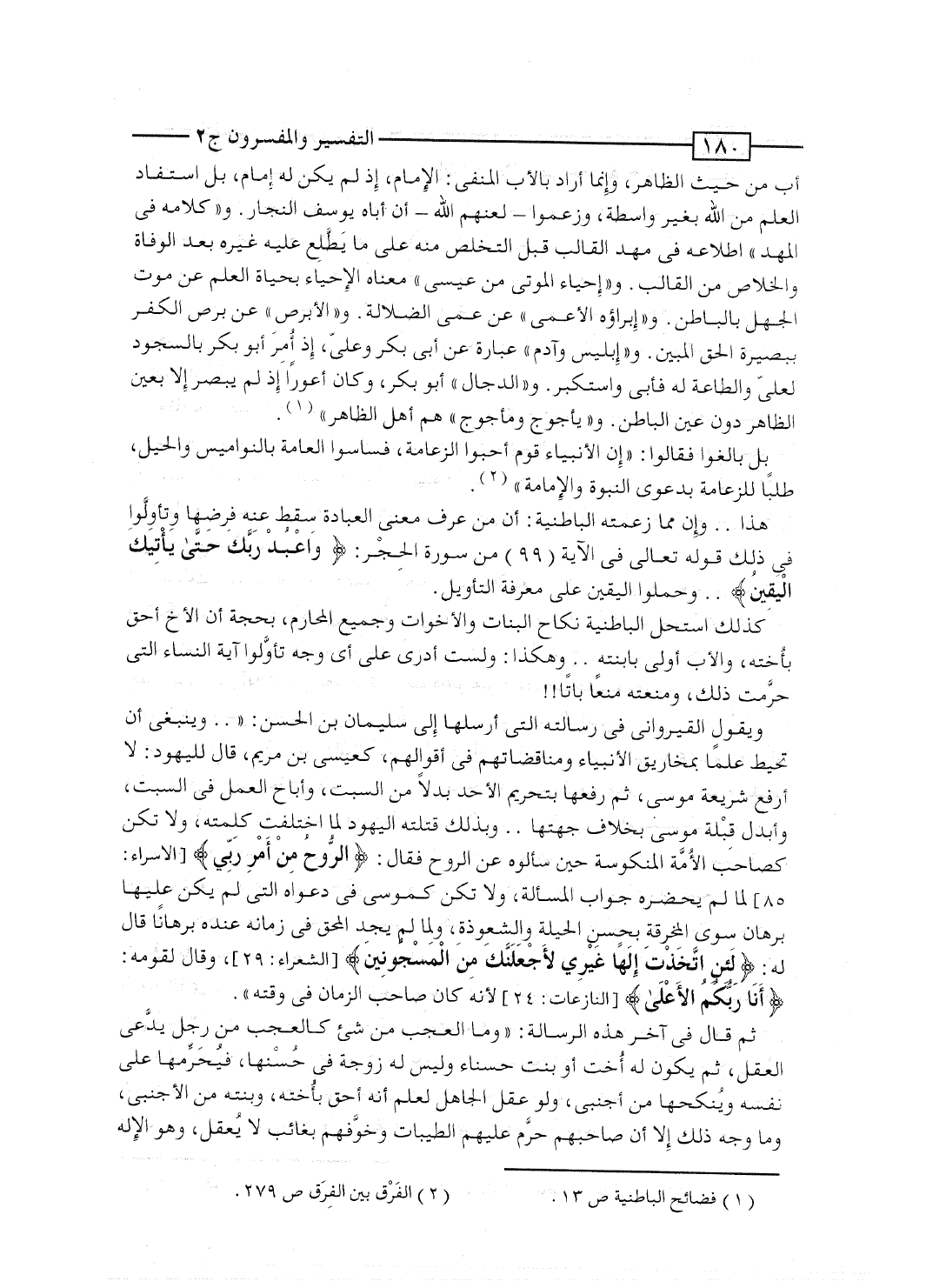 هذا.. وإن مما زعمته الباطنية: أن مَن عرف معنى العبادة سقط عنه فرضها وتأولَّوا فى ذلك قوله تعالى فى الآية [99] من سورة الحِجْر: {واعبد رَبَّكَ حتى يَأْتِيَكَ اليقين} .. وحملوا اليقين على معرفة التأويل.